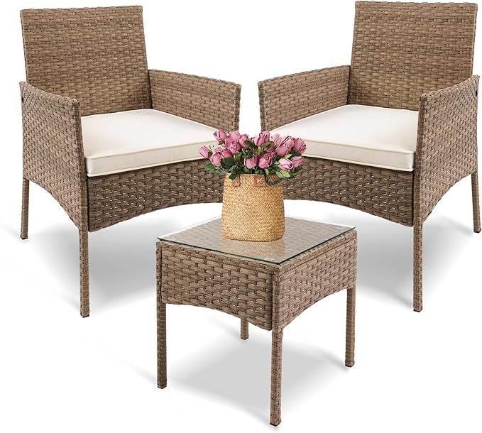 YIYAN 3 Pieces Patio Bistro Set Outdoor Wicker Furniture Outdoor Porch PE Rattan Wicker Chairs Furniture Sets with Sofa Chairs,Glass Coffee Table and White Washable Cushion