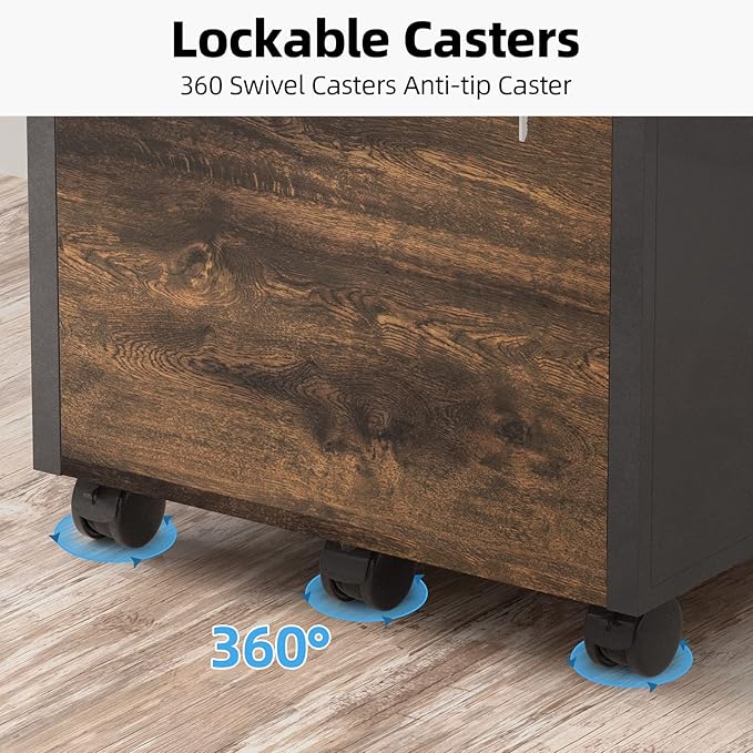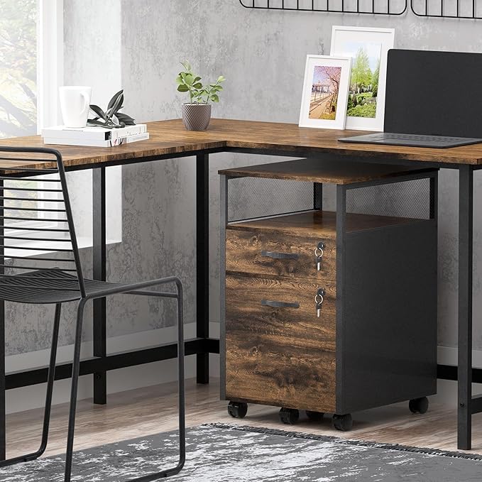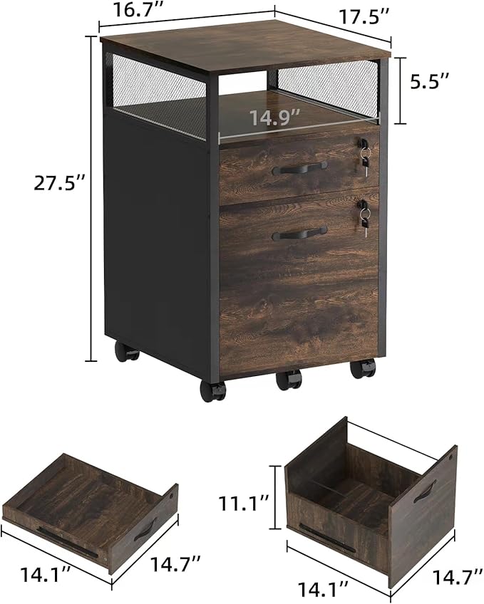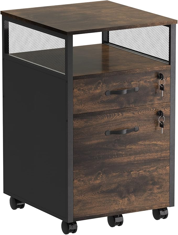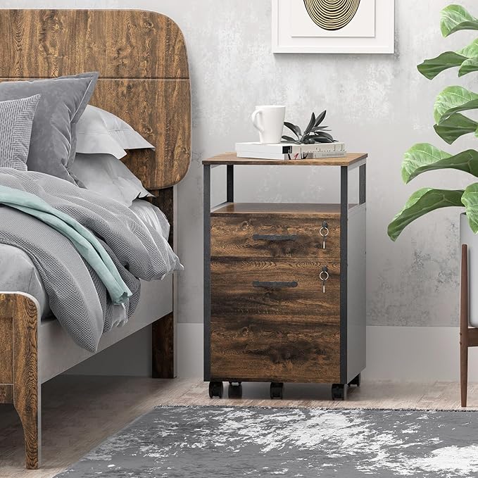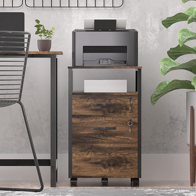 2 drawer file cabinet with lock, Wood Filing Cabinet for Home Office with Wheels and Open Shelf, Small Rolling Printer Stand and Under Desk File Cabinets for A4/Letter-Size Files-Brown