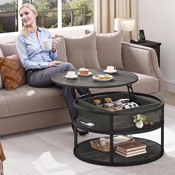 About This Round Lift Top Coffee Table: Adjustable lift up coffee table easily lifts up and down so you can...