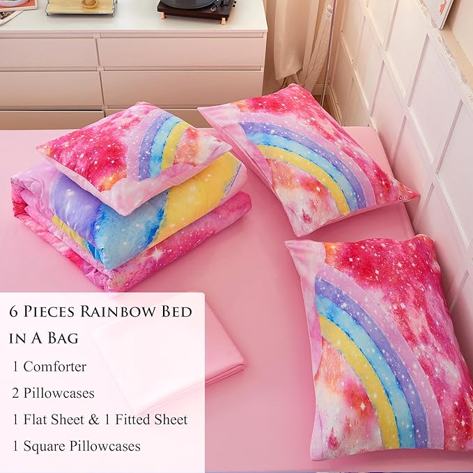 6 Pieces Rainbow Queen Size Bed in A Bag for Girls/Kids/Teens, Colorful Sparkle Tie Dye Girls Comforter Set, Soft Sparkle Glitter Galaxy Bed Sets for All Season