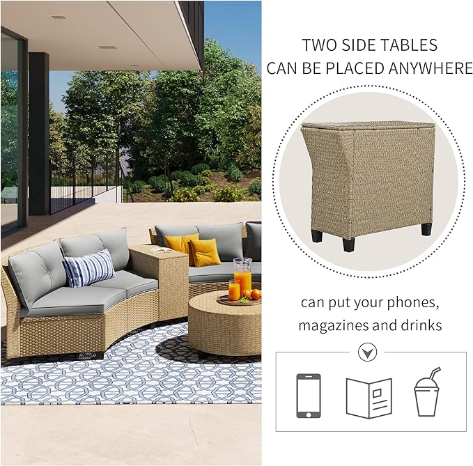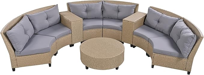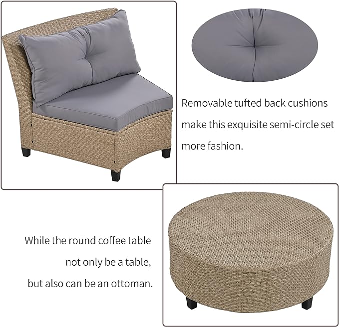 9 Pieces Outdoor Furniture Half Moon Wicker Patio Sets with Coffee Table, All-Weather Fan-Shaped Curved Sectional Sofa Couch with Gray Cushions, Onesize, Brown Rattan