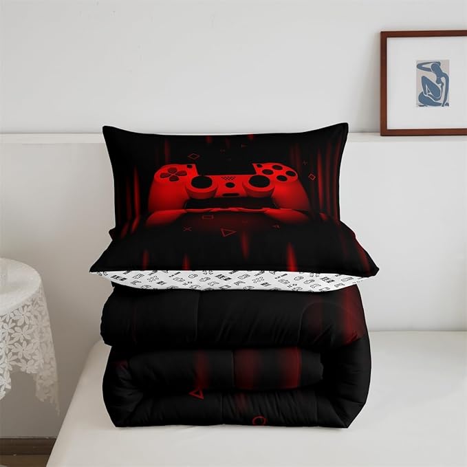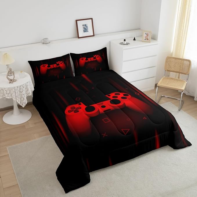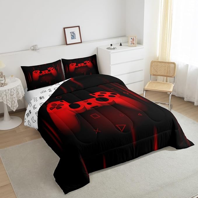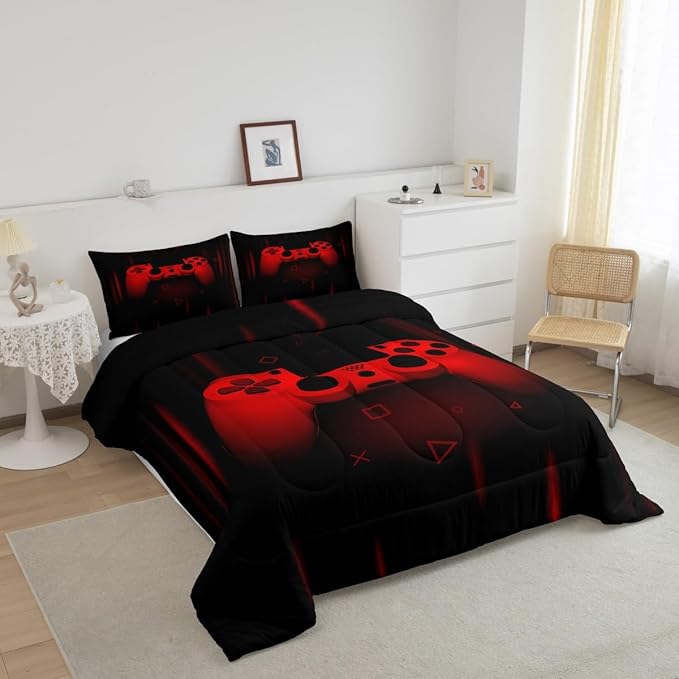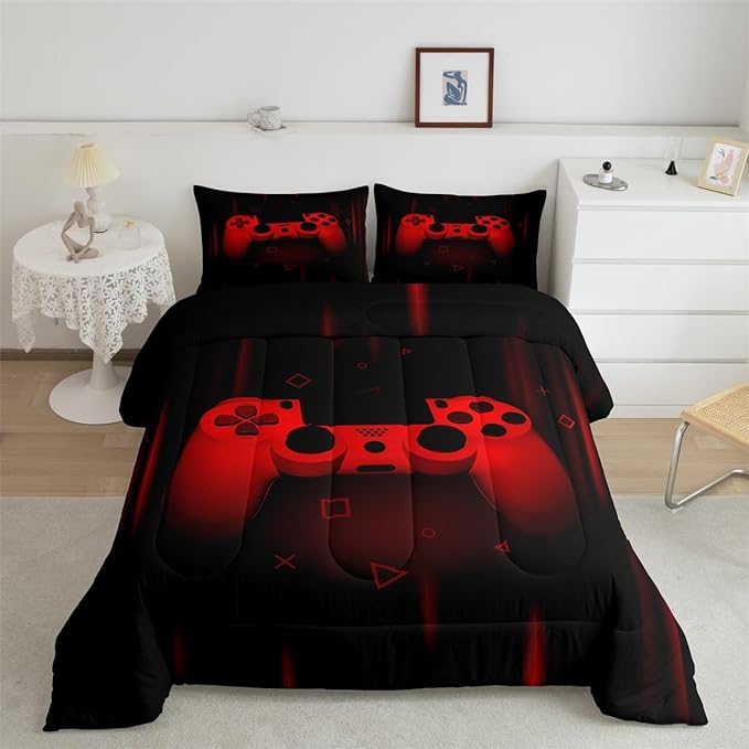 Feelyou Queen Comforter Set for Boys Gamer Bedding Set for Boys Kids Gaming Comforter Red Black Teen Child Gamer Room Decor Soft Game Geometric Duvet Quilted 1 Comforter with 2 Pillowcases Gamer Gifts