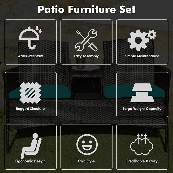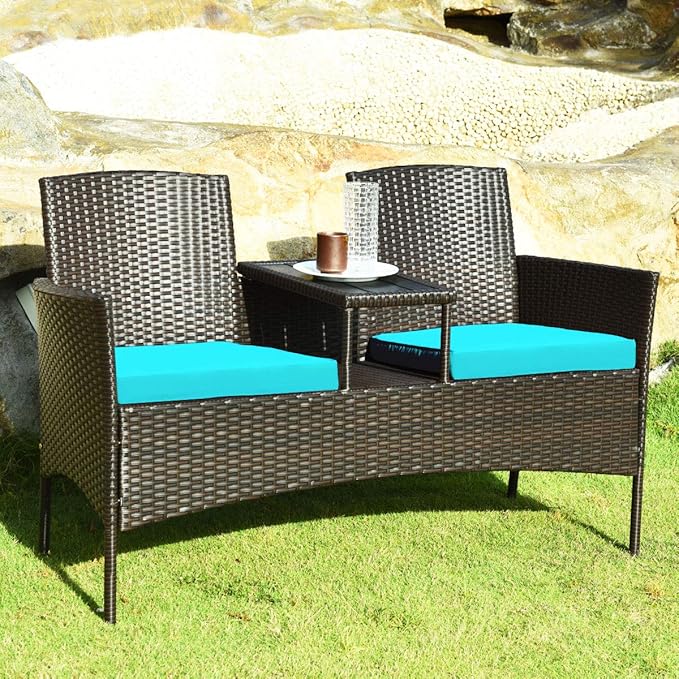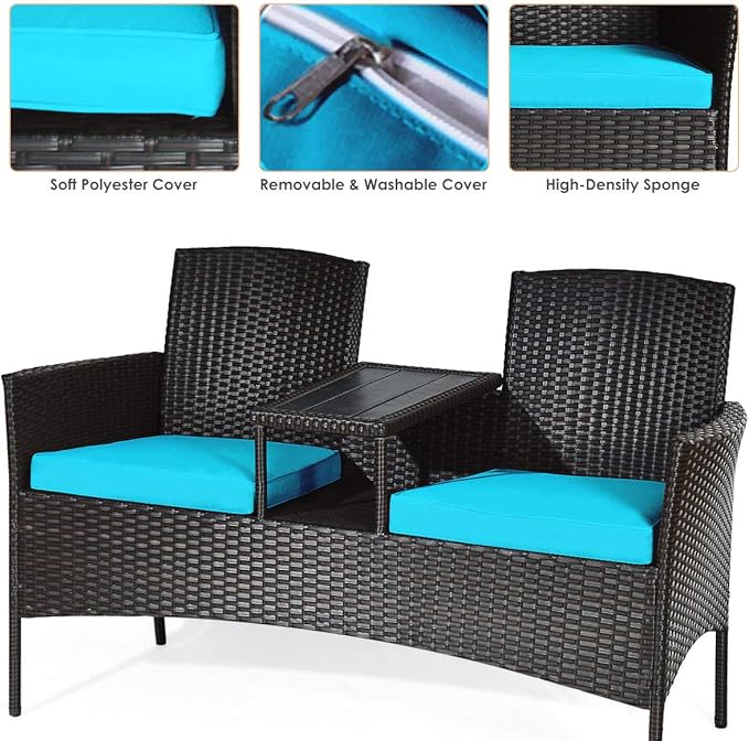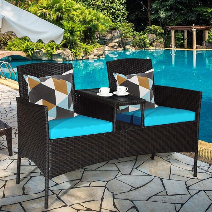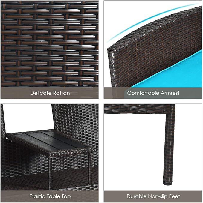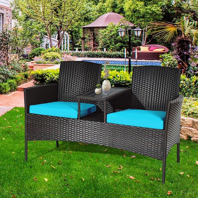 LUARANE Outdoor Rattan Sofas, Contract Patio Conversation Set Wicker Sofa Set with Built-in Coffee Table, Patio Furniture Set with Cushions, Rattan Loveseat for Lawn Backyard Garden (Brown+Blue)