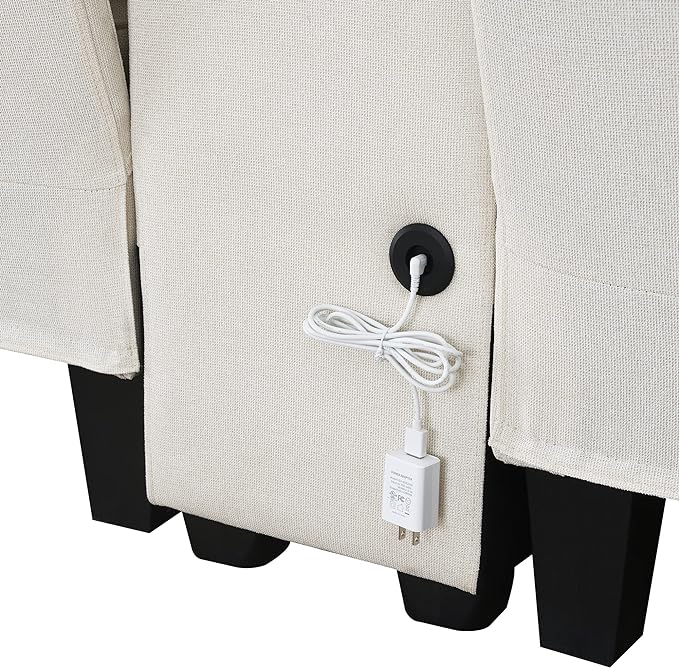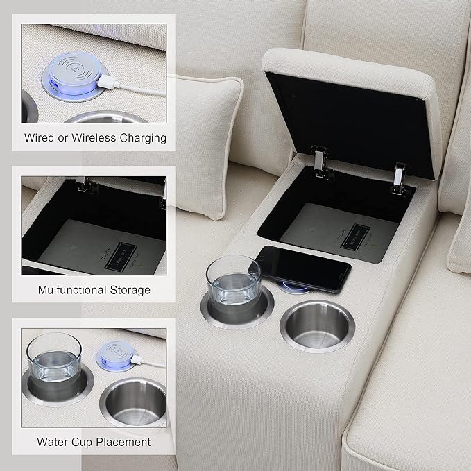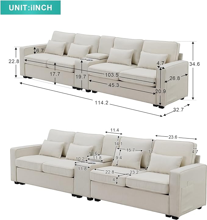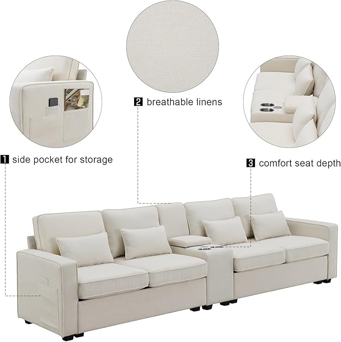 Upholstered Sectional Sofa with Console, 2 Cup Holders and 2 USB Ports & Wirelessly Charged, Modern Linen Fabric 4-Seat Couch with 4 Pillows for Living Room, Apartment, Office, 114.2inch