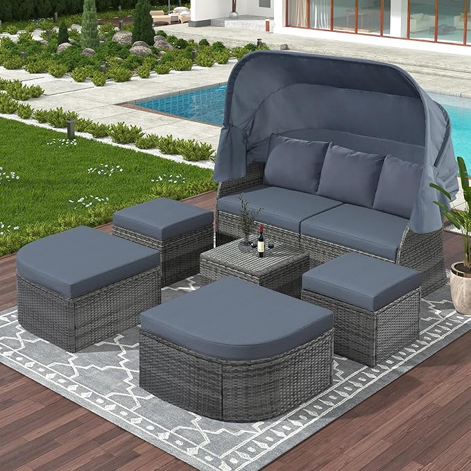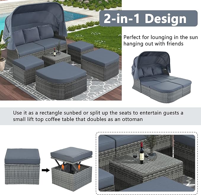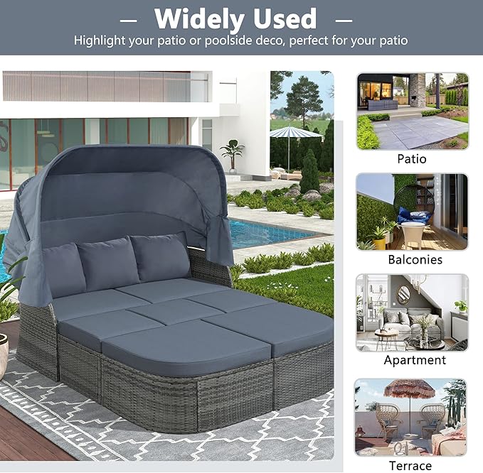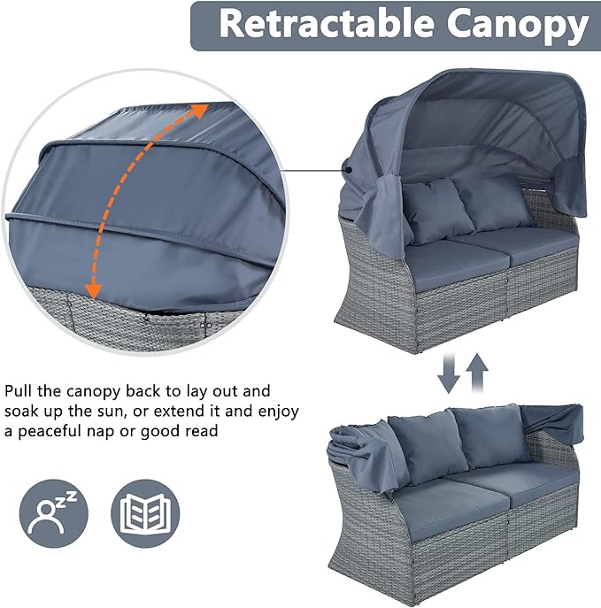 Rectangle Furniture Daybed Sunbed with Retractable Canopy, Outdoor Wicker Conversation Set with Cushions for Patio, Backyard, Porch, Garden, Onesize, Hb-Gray