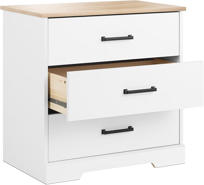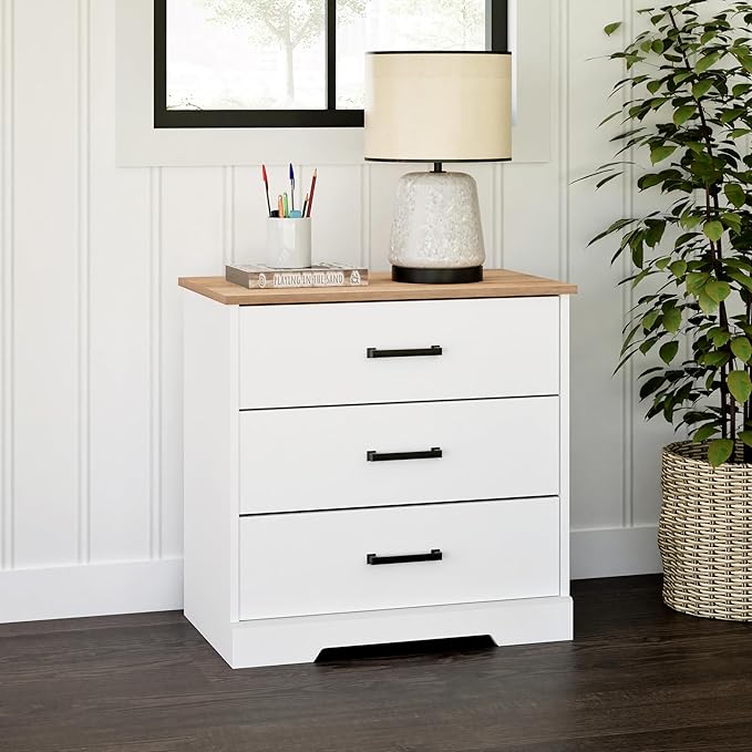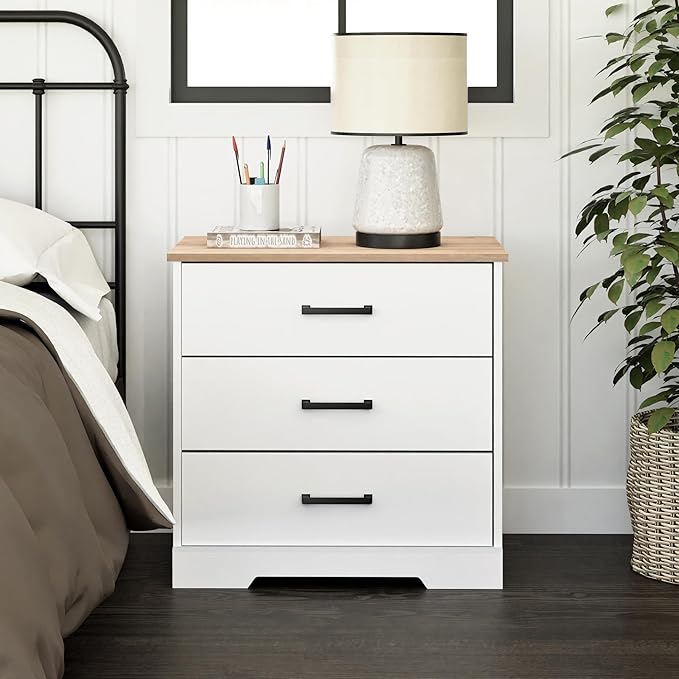 Prepac Three Drawer Nightstand, 16.25" D x 27.5" W x 26.75" H, White & Oak