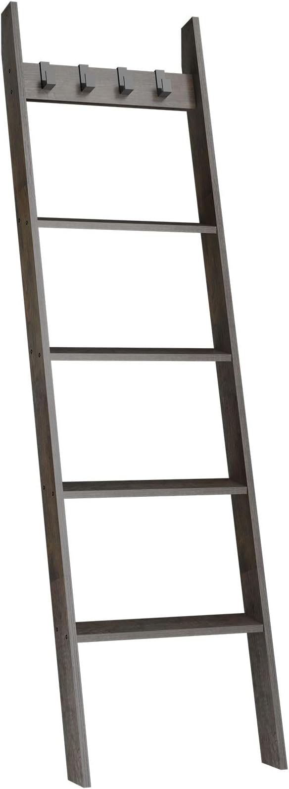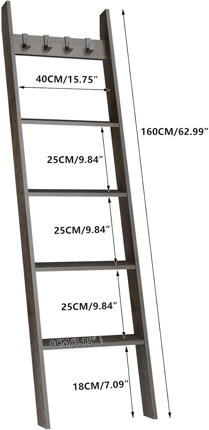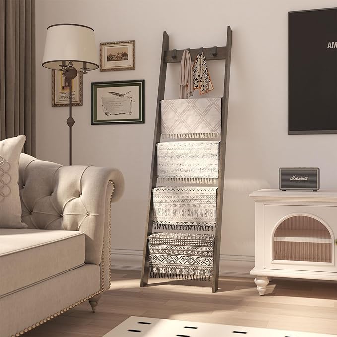 IBUYKE 5-Tier Blanket Ladder Shelf,Ladder Rack for Storage and Decor,Wooden Blanket Holder with Hooks,Easy Assembly for Bedroom,Rustic Brown TTR006G