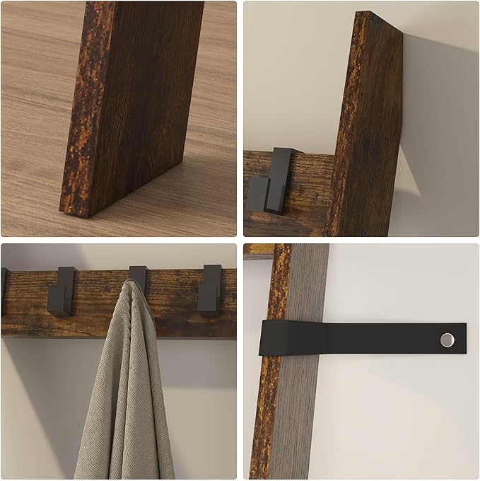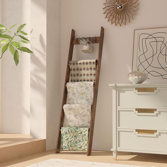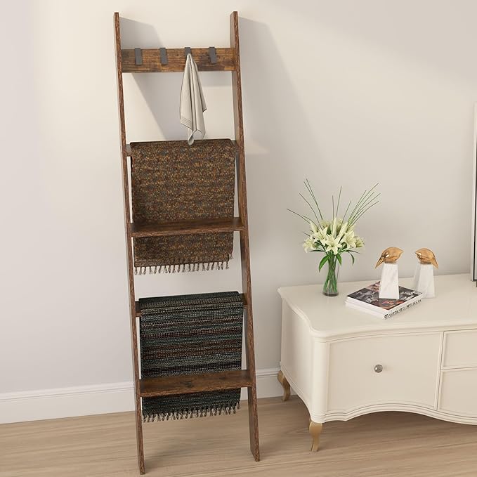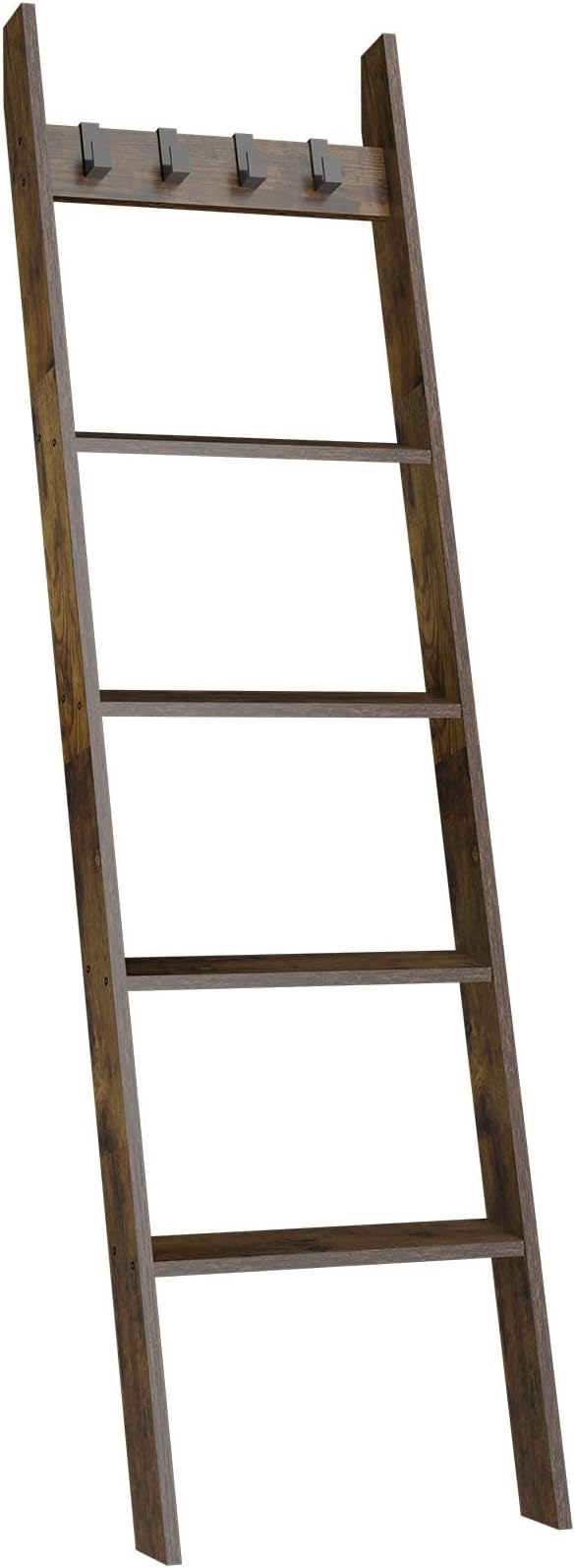 IBUYKE 5-Tier Blanket Ladder Shelf,Ladder Rack for Storage and Decor,Wooden Blanket Holder with Hooks,Easy Assembly for Bedroom,Rustic Brown TTR006H