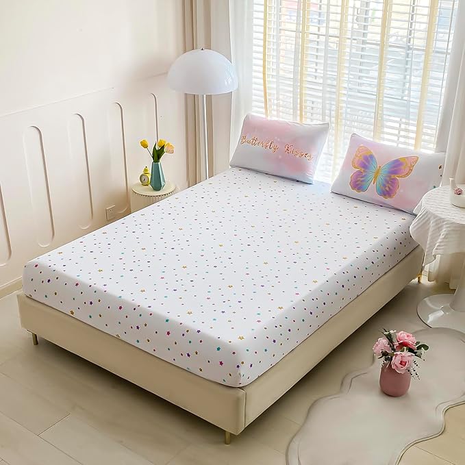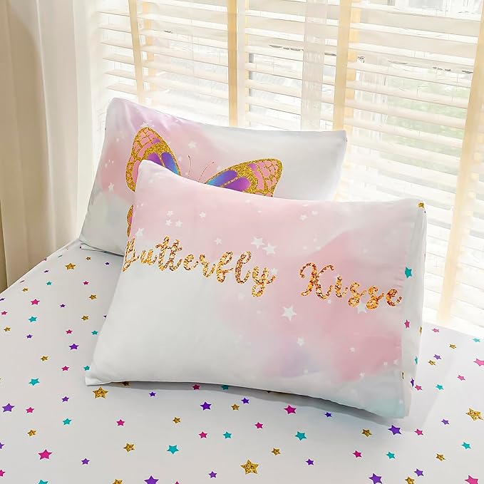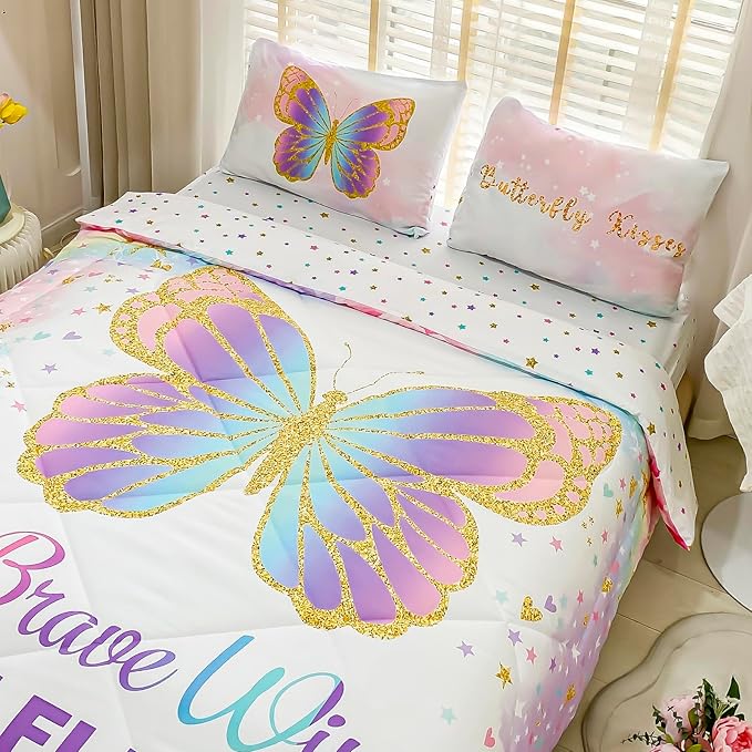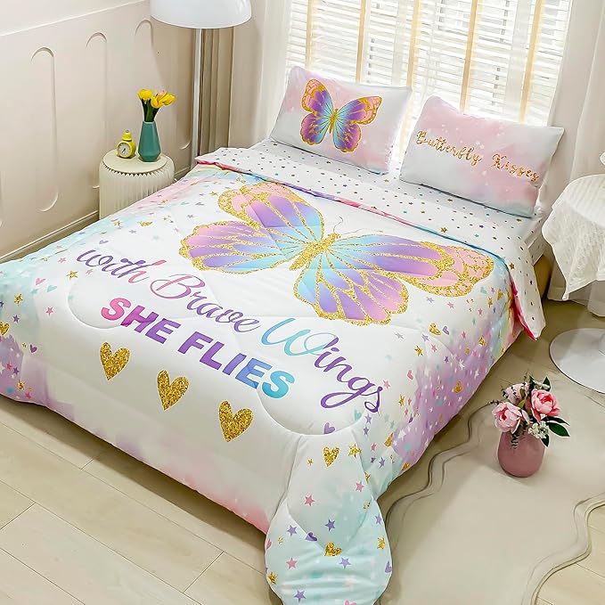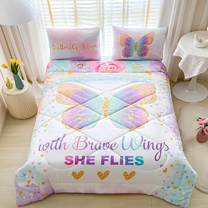 Twin Size Comforter Set for Girls, 5-Piece Bed in a Bag, 3D Colorful Butterfly Bedding Comforter Sheet Set, Ultra Soft and Fluffy, Pink & Rainbow Color