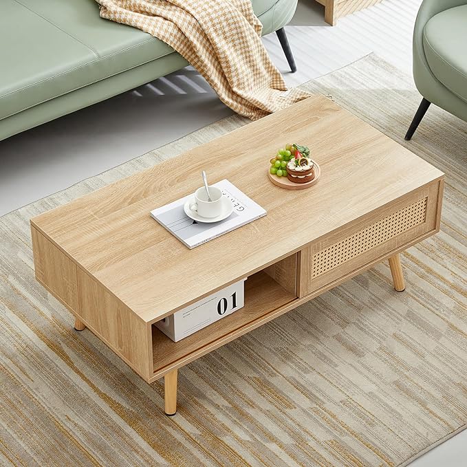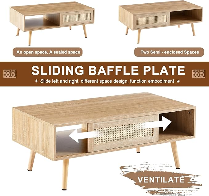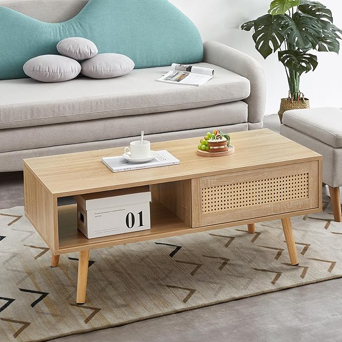 Brafab Rattan Coffee Storage Rectangle Accent Center Sofa Table with Sliding Door Panel Solid Wood Legsfor Living Room, 41.34" L x 21.65" W x 16.34" H, Natural