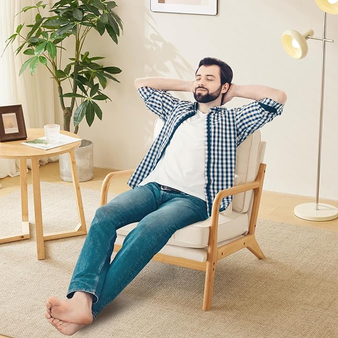 Bonnlo Coarse Beige Accent Chairs Set of 2, Upholstered Mid Century Modern Lounge Fabric Chairs Reading Chairs Side Sitting Chair Solid Wood Farmhouse Armchairs for Living Room, Bedroom, Guest Room