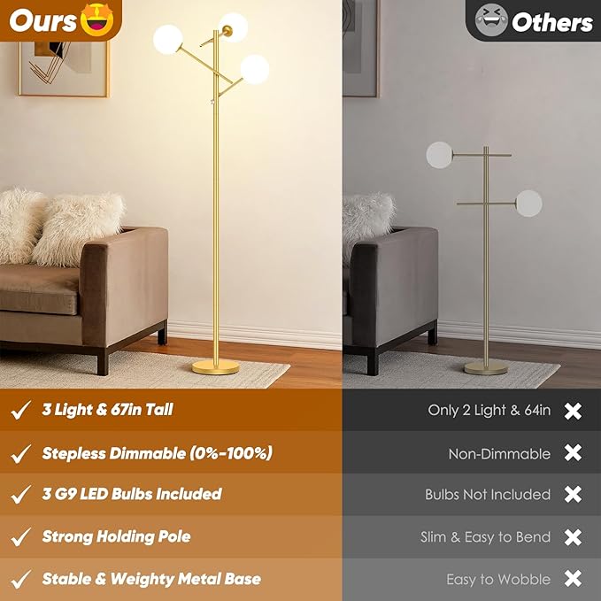 Dimmable Floor Lamp for Living Room, 67” Gold Standing Lamp with 3 Globe Glass Shade, Modern Tall Lamp, Adjustable 3-Light Tree Pole Lamp, Brass Corner Lamp for Bedroom Office Hotel, 3 Bulbs Included