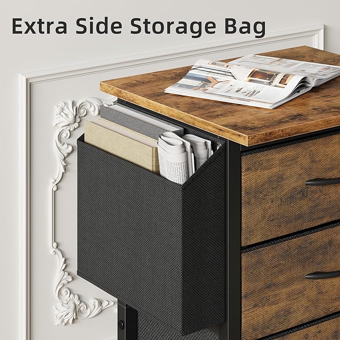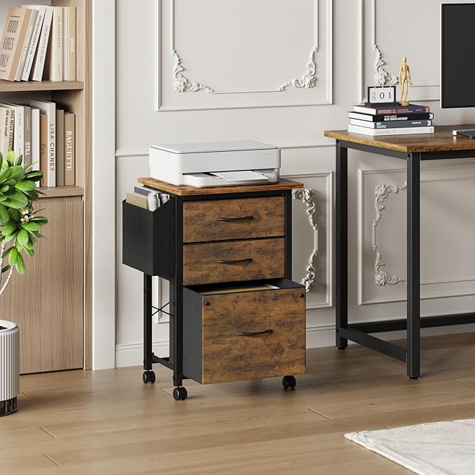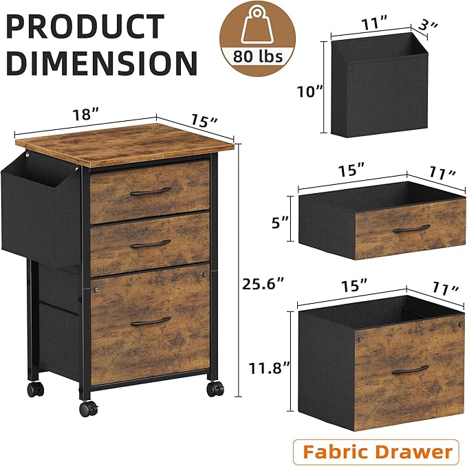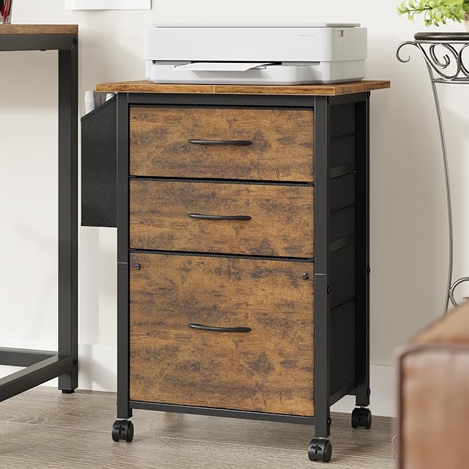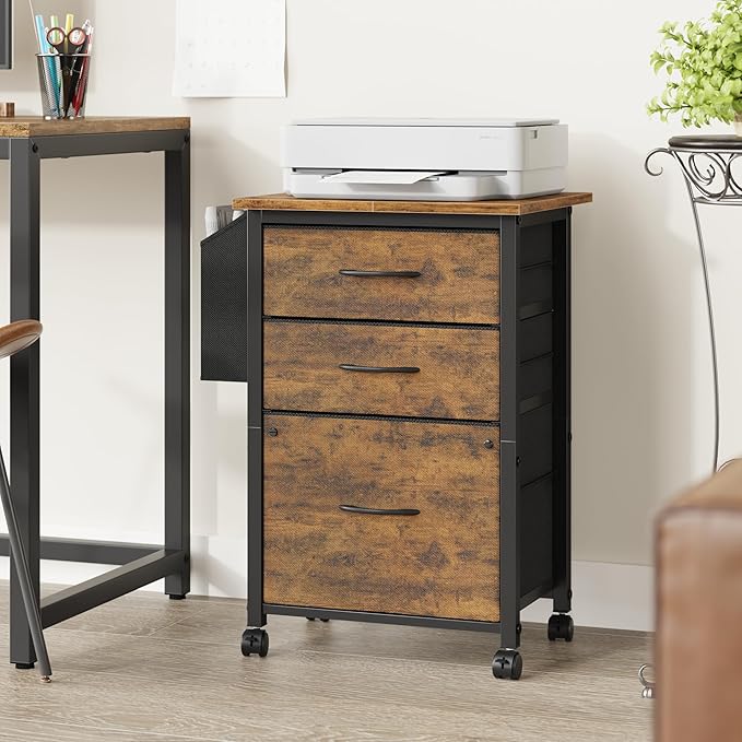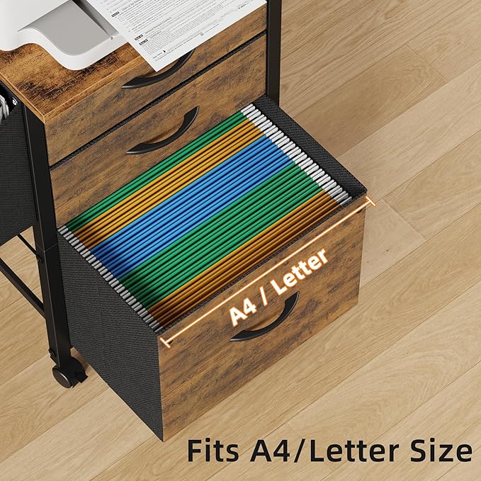 3 Drawer File Cabinet with 18'' Extended Board, Fabric Drawer, Mobile Filing Cabinet Fits A4/Letter Size Files, Rolling Printer Stand with Storage Bag, File Cabinet Home Office, Rustic Brown