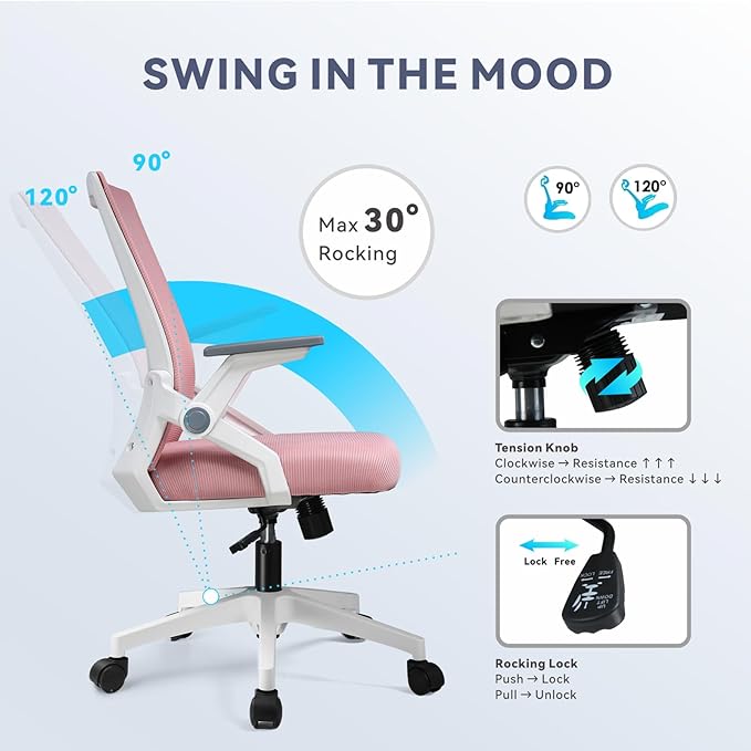 COMHOMA Office Chair with Flip-up Armrests Ergonomic Computer Desk Chair Foldable Mesh Task Chair with Wheels Adaptive Lumbar Support Swivel Tilt Comfortable Study Chair for Student, Pink