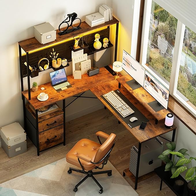 Yoobure L Shaped Desk with Pegboard, Reversible Gaming Desk with LED Lights & Power Outlets, Computer Desk with Drawers & Storage Shelves, Office Desk with Monitor Stand Corner Desk Home Office Desks