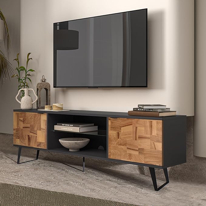 Atelier Mobili Mid Century Modern Door Glass Shelf TV Stand with Storage for TVs up 80 to Inches, Media Console for Living Room, Entertainment Center or Farmhouse TV Stand (Wood Patchwork)