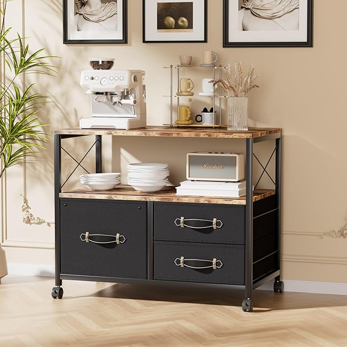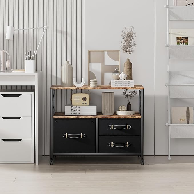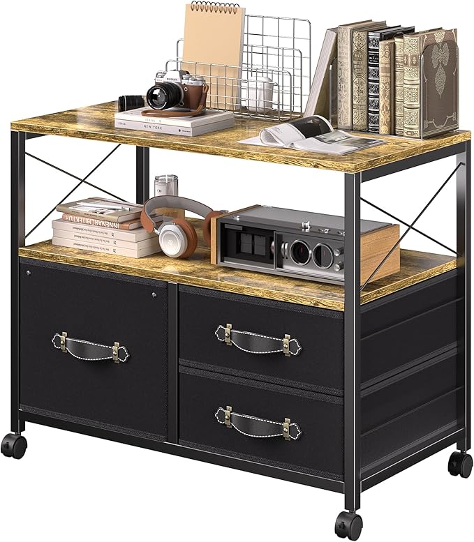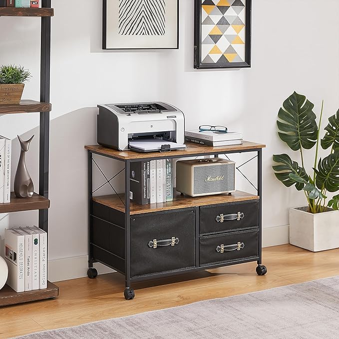 VECELO Mobile File Cabinet, Rolling Printer Stand with Open Shelf Fabric Lateral Storage Station for Home Office, Adapts Letter Size Hanging Folders, Brown, 3 Drawer