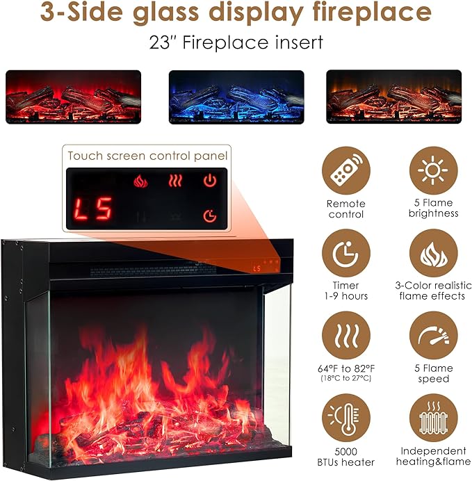 About This 【3-Sides Glass Display】: 23〞and 3-side glass display TV stand fireplace features 3 different colors realistic flame effects, 5...