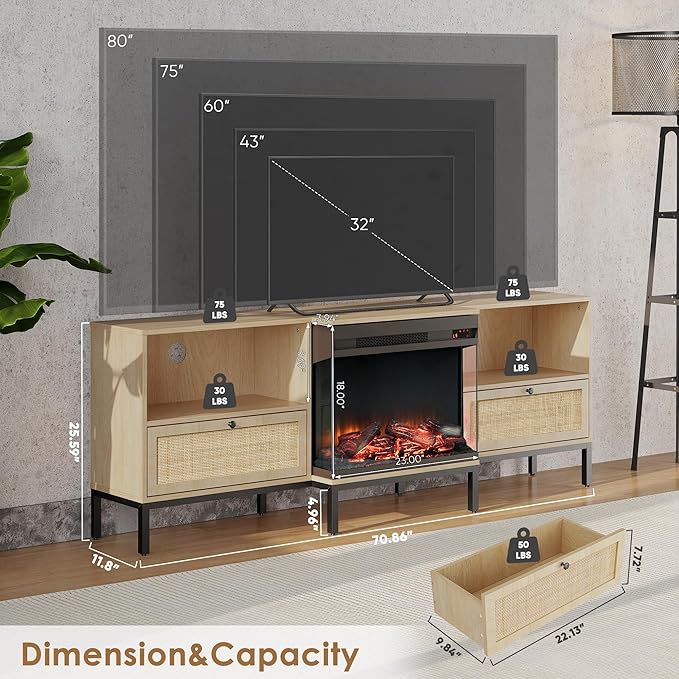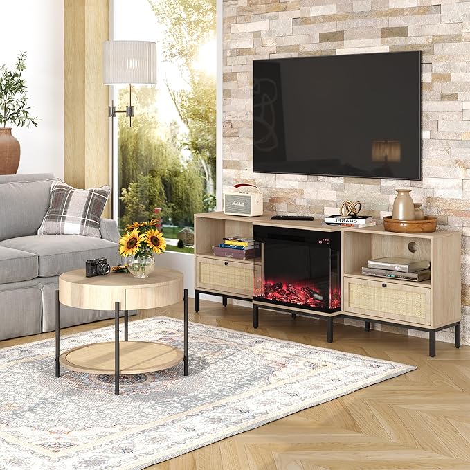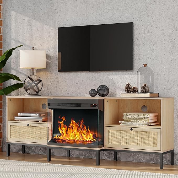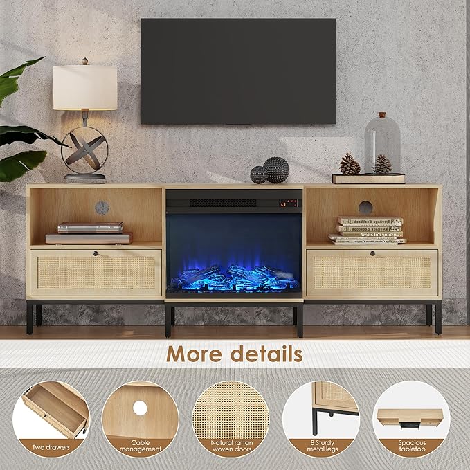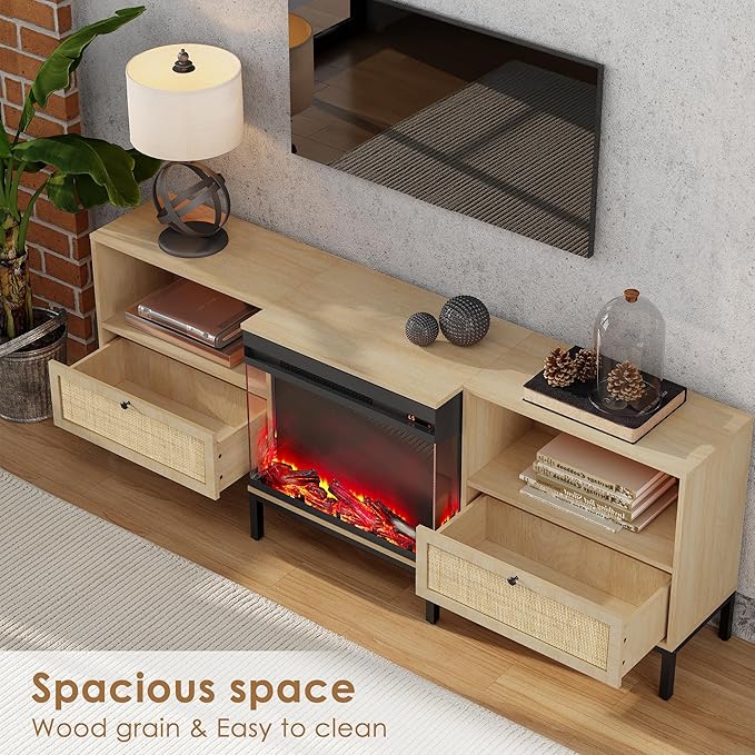 3-Sided Glass Fireplace TV Stand for TVs up to 80", Entertainment Center Electric Fireplace TV Stand with Rattan Drawers Boho Natural