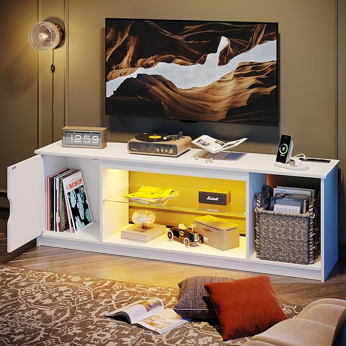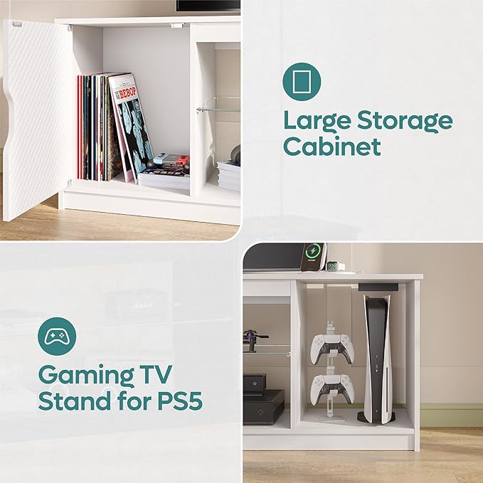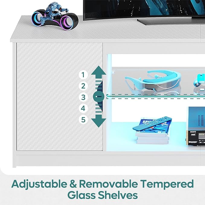 Bestier LED TV Stand with Power Outlets for 55/60/65 Inch TV, Gaming Entertainment Center with Cabinet for PS5, Modern TV Cabinet with Adjustable Glass Shelves for Bedroom 58 Inch Carbon Fiber White
