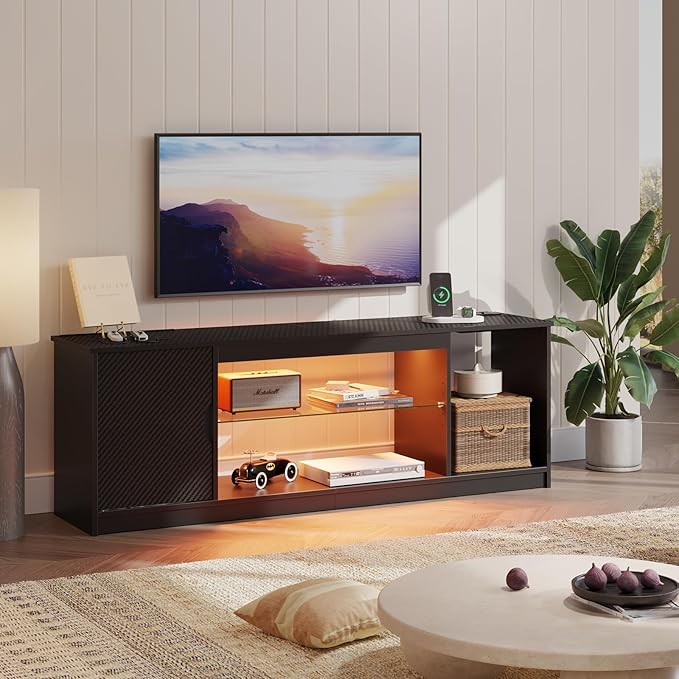 Bestier LED TV Stand with Power Outlets for 55/60/65 Inch TV, Gaming Entertainment Center with Cabinet for PS5, Modern TV Cabinet with Adjustable Glass Shelves for Living Room, Bedroom 58 Inch,Black