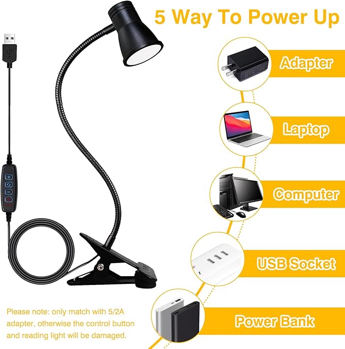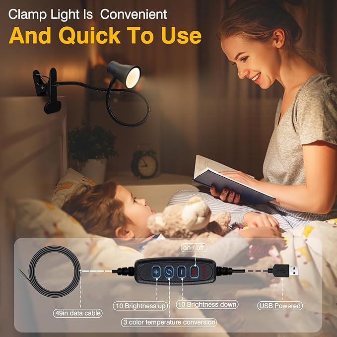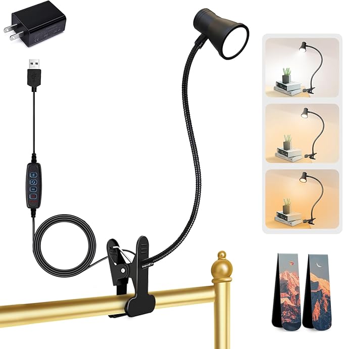 Clip on Light Reading for Bed LED Desk Lights 3 Color Modes 10 Brightness USB Lamp Eye Care 360° Flexible Gooseneck Dimmable for Headboard Computer Read Books Task Lamps with Adapter Bookmark(Black)