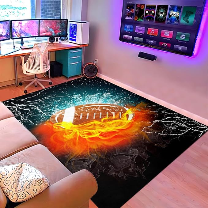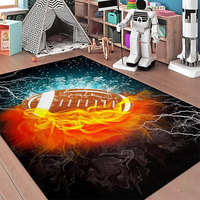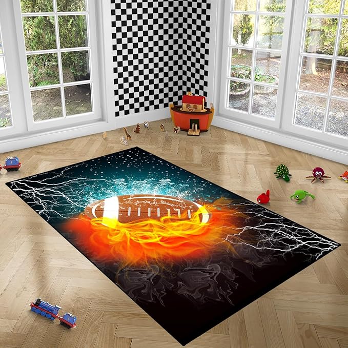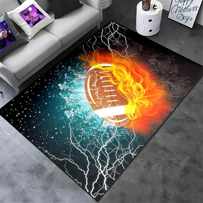 Football Rug Football Decor for Boys Bedroom Football Rug Water and Fire Cool Room Decoration Soccer Rug for Boys Room Football Printed Rug for Kids Room Playmat Rugs for Kid Room Living Room,4'5''×6'