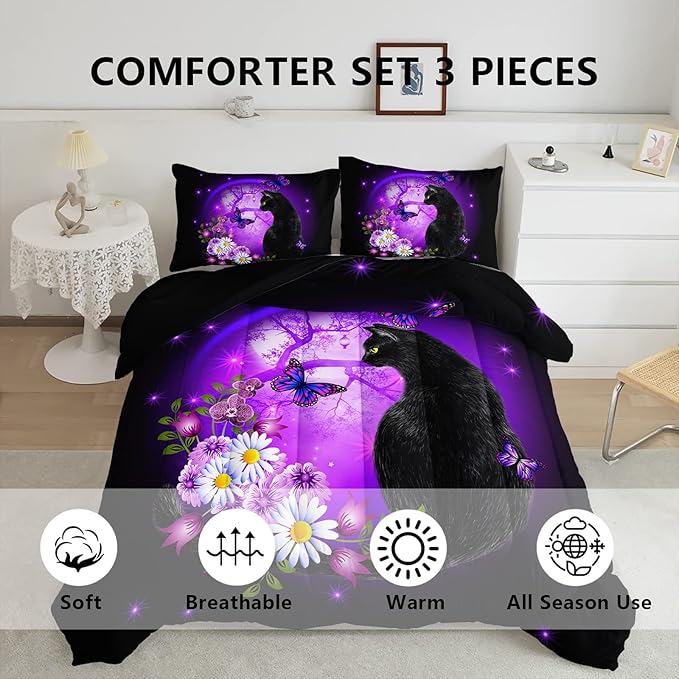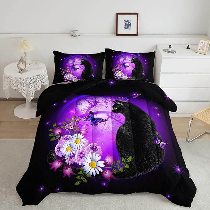 Black Cat Bedding Cartoon Cat Comforter Set Queen,Daisy Butterflies Printed Kids Bedding Set for Kids Boys Girls Adults Room Decor,Kids Comforter Set All Season,1 Quilt 2 Pillow Cases,Purple