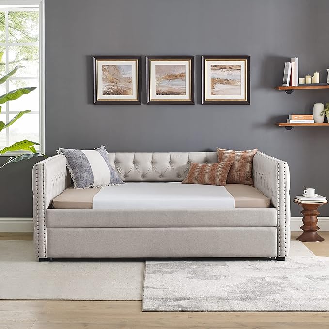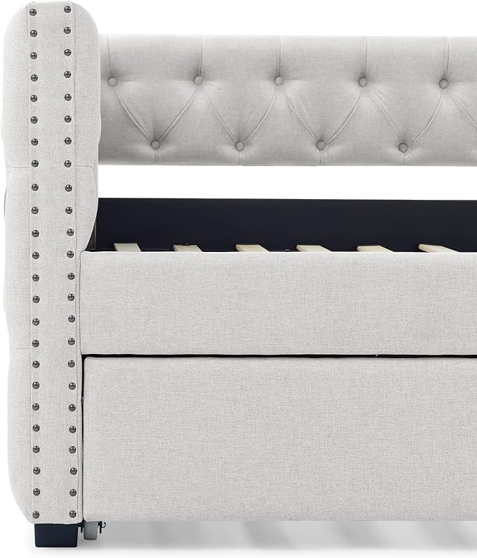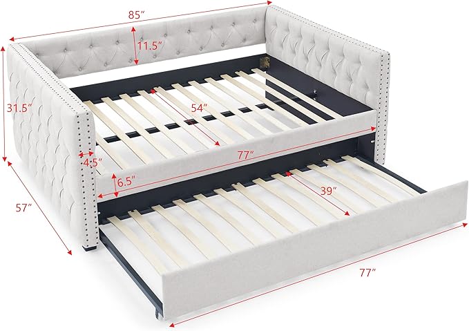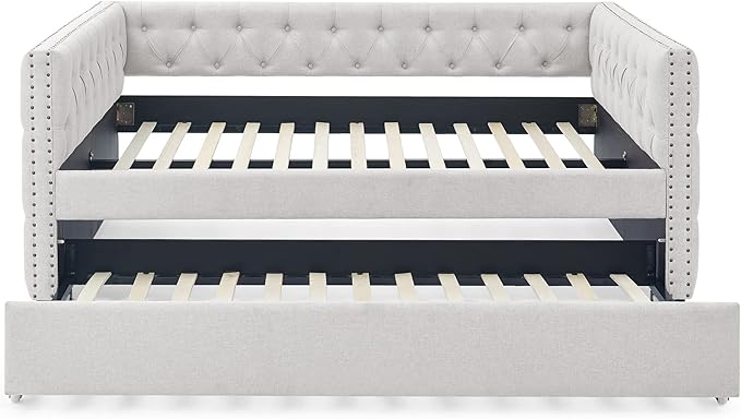 Full Size Upholstered Daybed with Twin Trundle, Bedroom Wooden Sofa Bed Frame w/Button Tufted and Copper Nail on Square Arms, No Spring Box Need, for Dorm,Beige (85"x57"x31.5")
