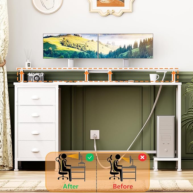 Furologee 55in Computer Desk with 4 Drawers, LED Gaming Desk with Power Outlets, Office Desk with Full Monitor Stand and Storage Shelf, Study Work Desk for Home Office Bedroom, White
