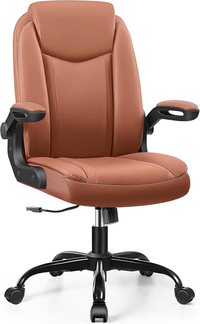 Office Chair Ergonomic Computer Desk Chair, Executive Leather Office Chair with Adjustable Flip-up Armrests Height, Swivel Task Chair with Lumbar Support Rocking Function for Home Office(Brown)