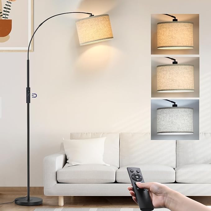 Arc Floor Lamps with Remote Control and Stepless Dimmable Color Temperature and Brightness Standing Lamp with Adjustable Beige Hanging Shade Pole Lamp for Bedroom Office, 9W Bulb Included, Black
