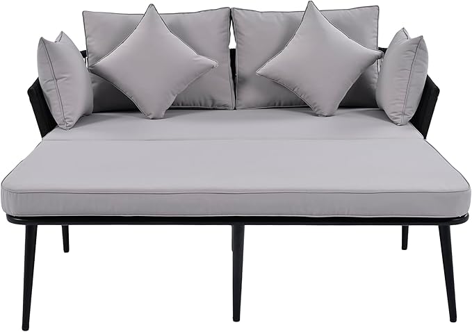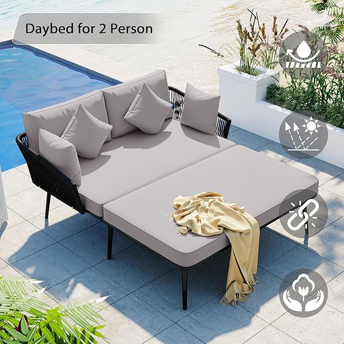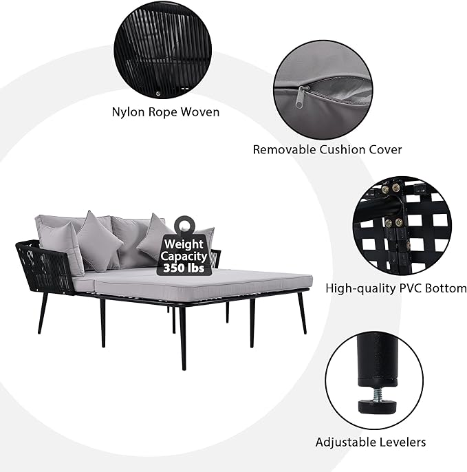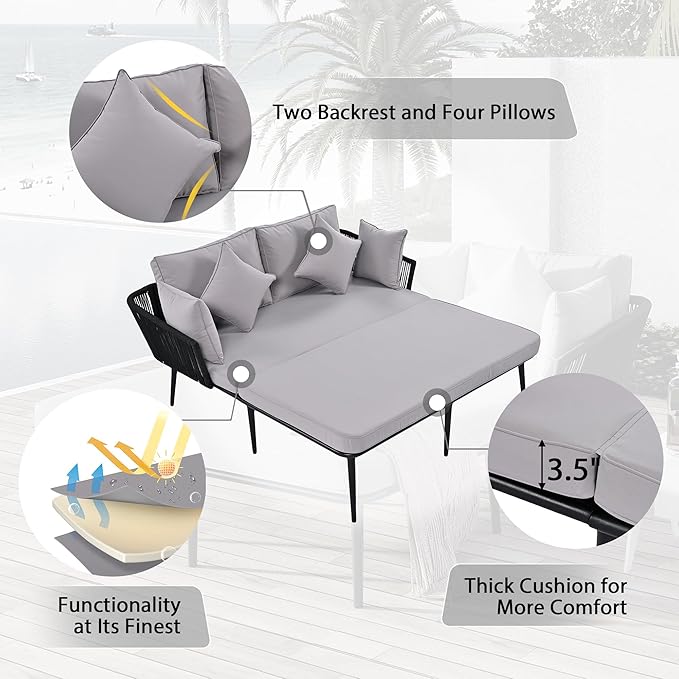 Patio Daybed Set for 2, Outdoor Furniture All-Weather Sofa Sunbed with Adjustable Iron Feet, Woven Nylon Rope Backrest, Washable Cushions and Pillows, for Balcony, Poolside, Gray