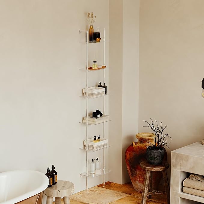 Small Acrylic Ladder Bookshelf, 9.5" D x 15.6" W, 6-Tier Clear Wall Mounted Book Shelf for Small Spaces, Multipurpose Bookcase for Living Room, Bathroom, Office, Modern, 86" H
