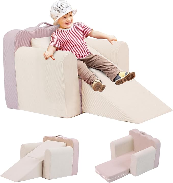 3-in-1 Toddler Chair Comfy Kids Sofa Chair,Toddler Couch Fold Out with Folding Ottomans,Foldable Baby Couch for Girls and Boys,Convertible Kids Chair Cozy to Lounger Pull Out for Playroom,Beige Pink