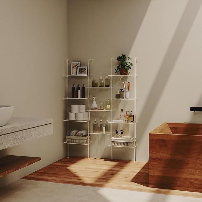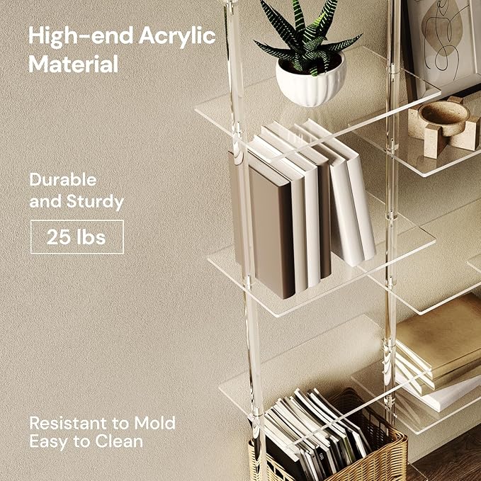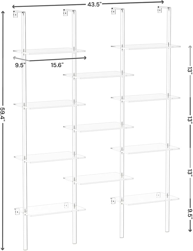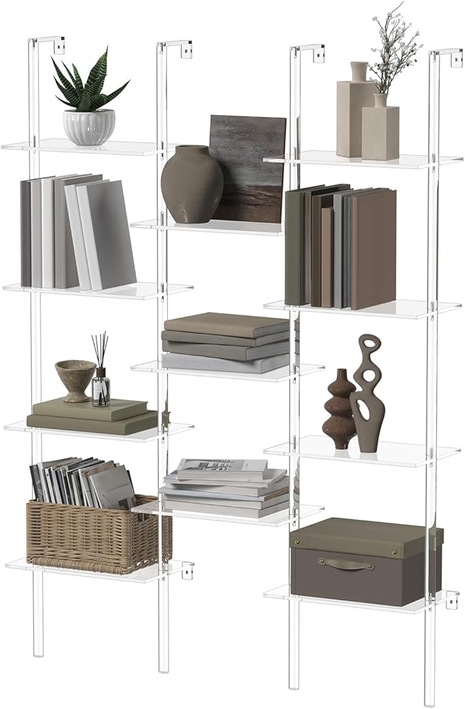 Acrylic Bookshelf, Wall Mounted, 4-Tier Clear Ladder Bookshelf with 11 Open Shelves, Multipurpose Bookcase for Living Room, Bathroom, Office, Modern, 9.5" D x 43.5" W x 59.4" H