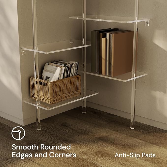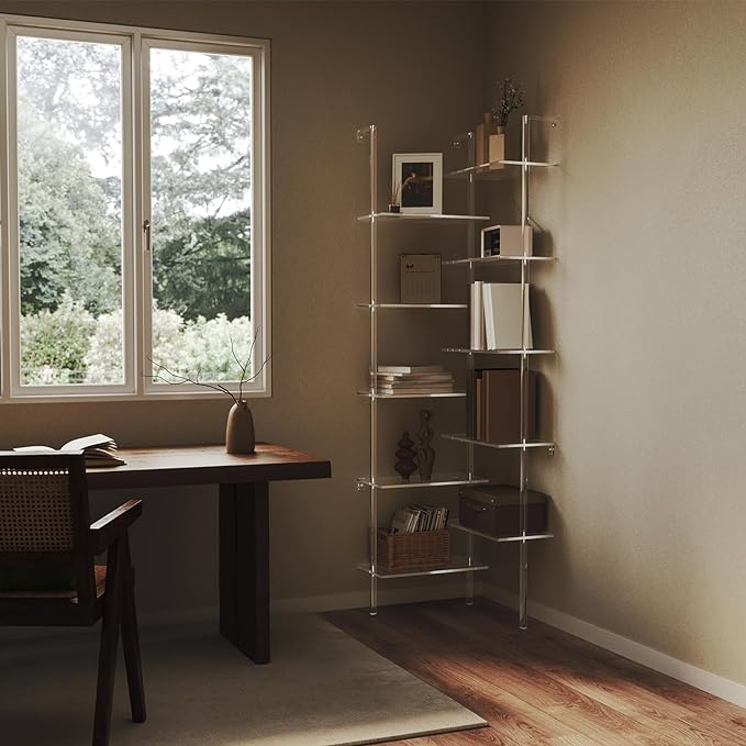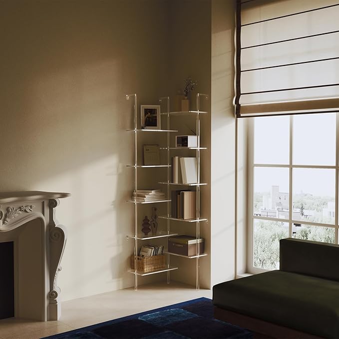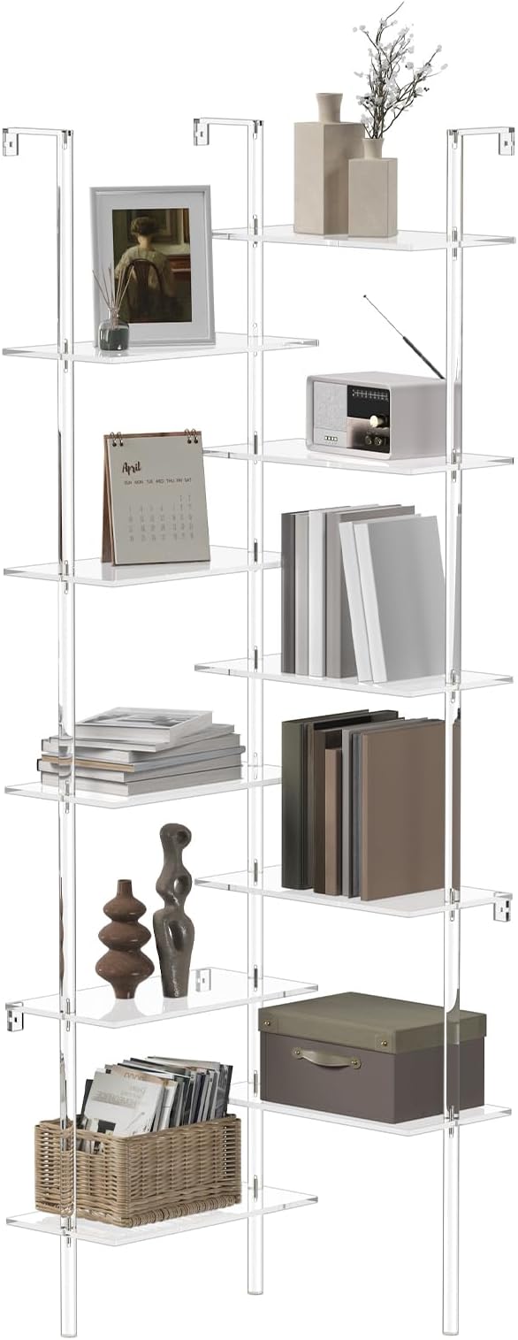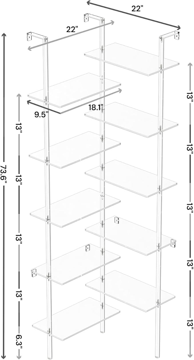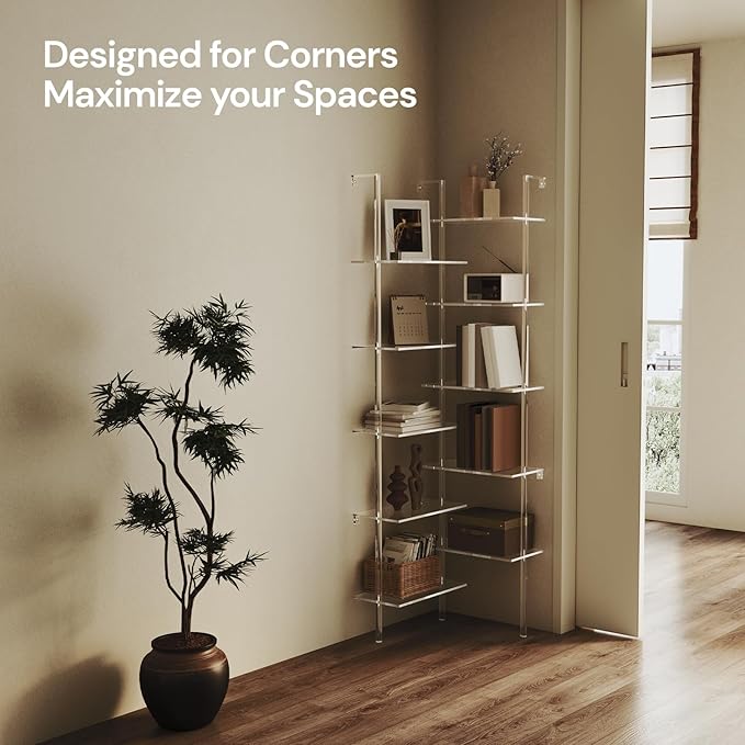 Acrylic Corner Bookshelf, Wall Mounted, 10-Tier L Shaped Bookshelf with Open Shelves, Multipurpose Clear Ladder Bookcase for Living Room, Bathroom, Office, Modern, 73.6" H