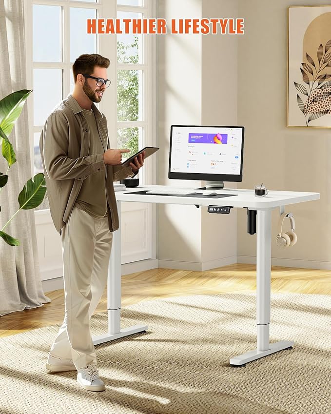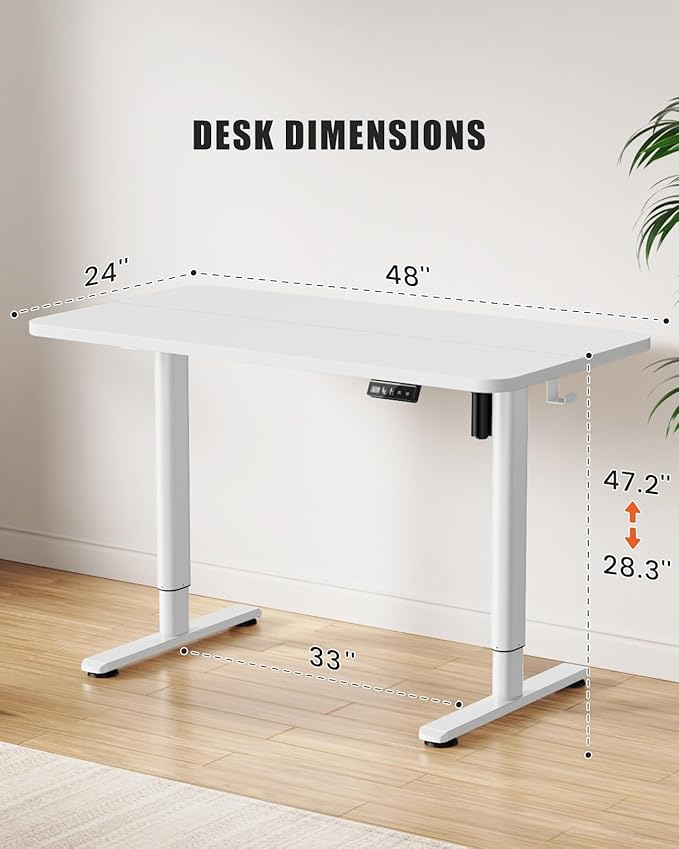 Electric Standing Desk Adjustable Height Stand Up Desk, 48" x 24" Sit Stand Desk, Low Noise Home Office Desk, Computer Desk with Splice Board, Child Lock & Memory Function, White