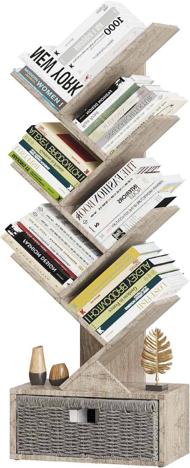 Vagusicc 6 Tier Tree Bookshelf, Modern Floor Standing Bookcase with Storage Drawer, Tall Wood Book Storage Rack for CDs/Books, Utility Book Organizer Shelves for Bedroom/Living Room/Home Office/Corner