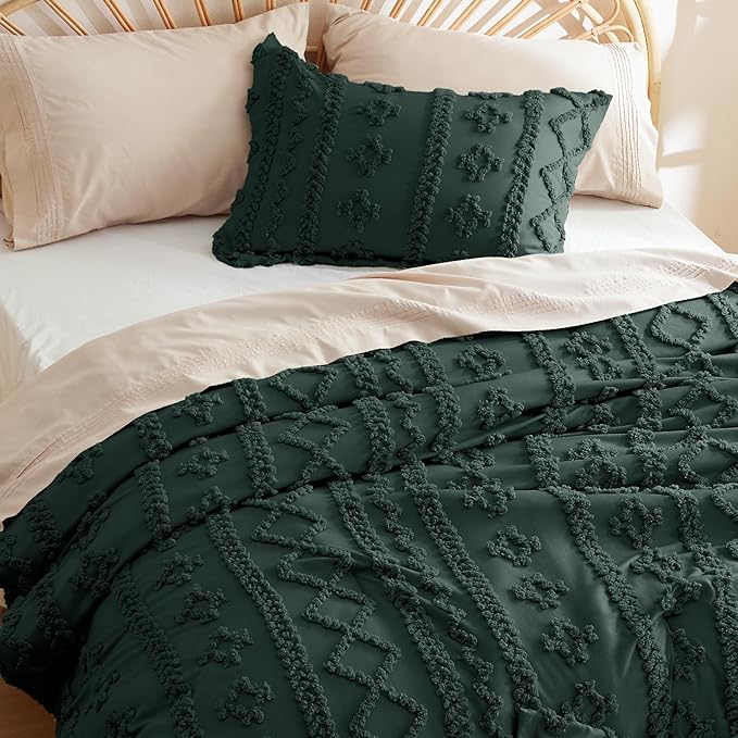 Bedsure Twin/Twin XL Comforter Set Dorm Bedding - Dark Emerald Green Boho Bedding Comforter Set, 2 Pieces Farmhouse Shabby Chic Embroidery Bed Set, Soft Jacquard Tufted Comforter for College