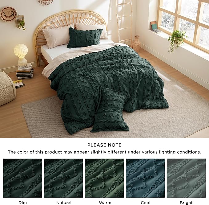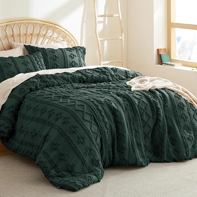 Bedsure Tufted Boho Comforter Set Full - Dark Emerald Green Boho Bedding Comforter Set, 3 Pieces Farmhouse Shabby Chic Embroidery Bed Set, Soft Jacquard Comforter for All Seasons