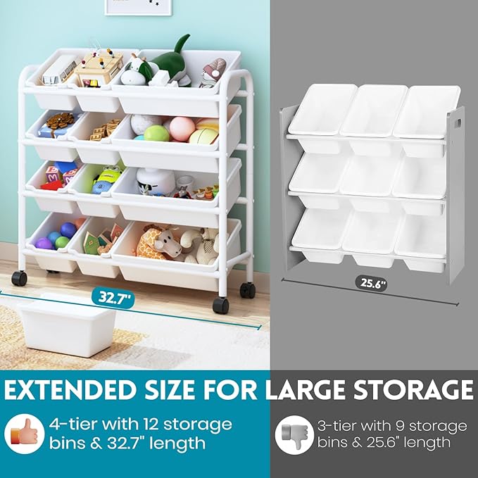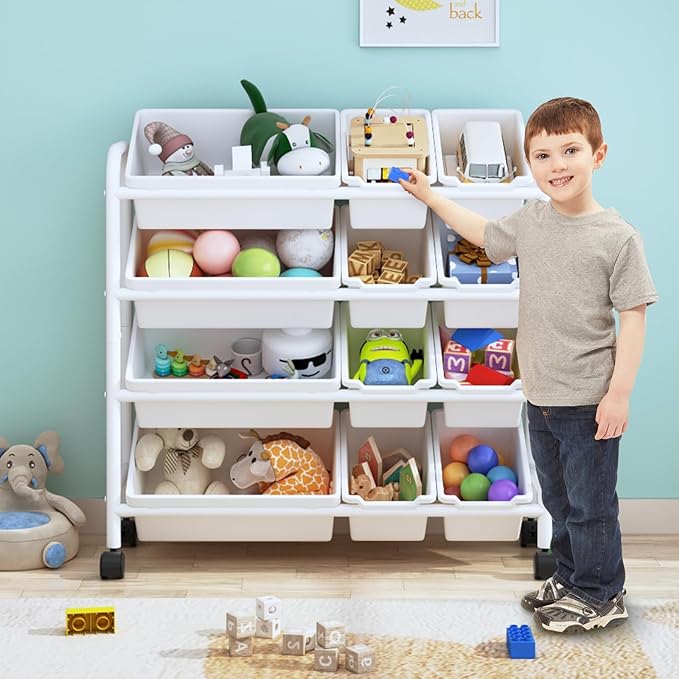 Kids Toy Storage Organizer with 12 Plastic Bins, 4-Tier Metal Toy Storage Rack, Metal Toy Organizer with Storage Bins for Kids Room, Playroom and Nursery, White