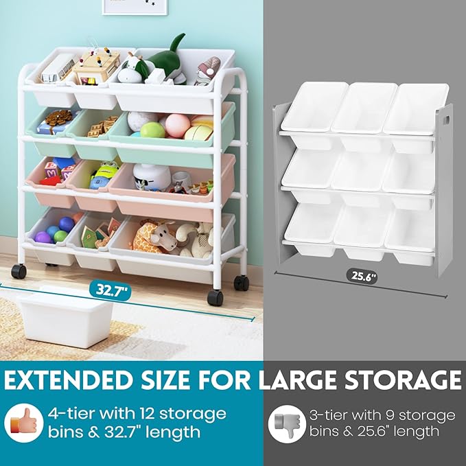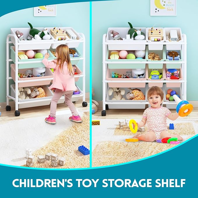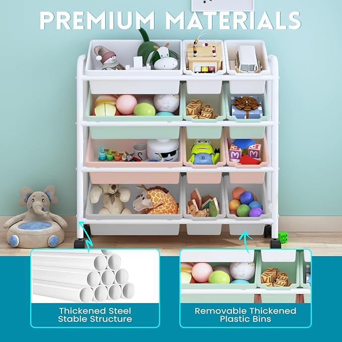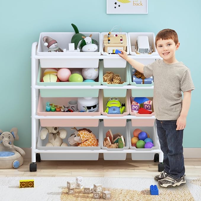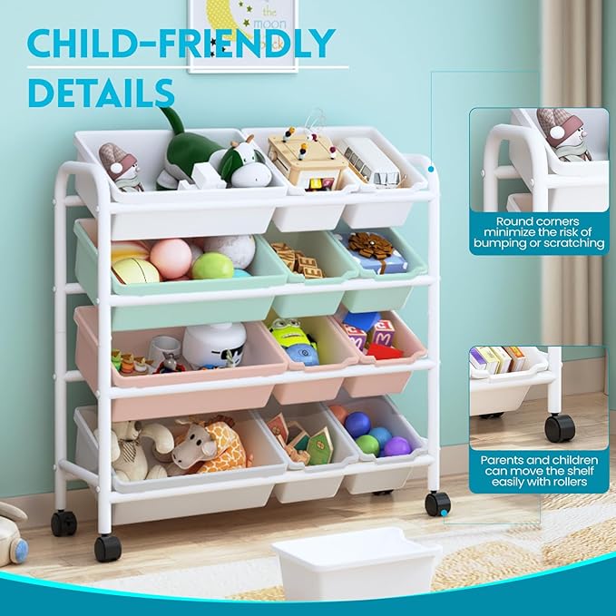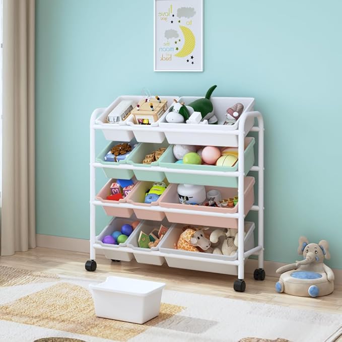 Kids Toy Storage Organizer with 12 Plastic Bins, 4-Tier Metal Toy Storage Rack, Metal Toy Organizer with Storage Bins for Kids Room, Playroom and Nursery, Multi-Color
