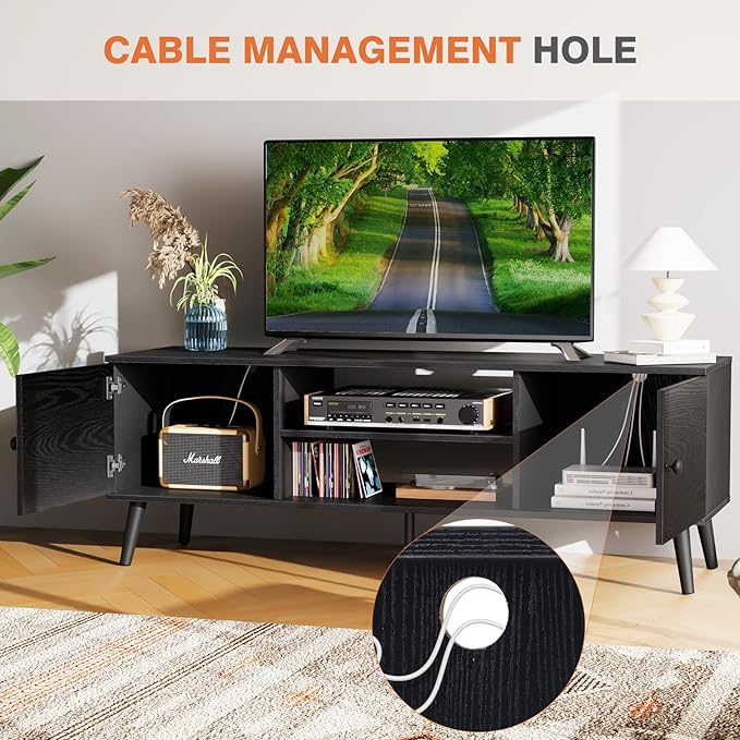 Sweetcrispy TV Stand for 55 60 inch Television, Entertainment Center with Storage, 2 Cabinet Media Console Table, Soft Hinge Door with Handle, Wood Feet, Living Room, Bedroom Furniture, Charcoal Black