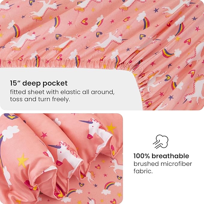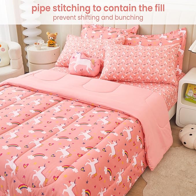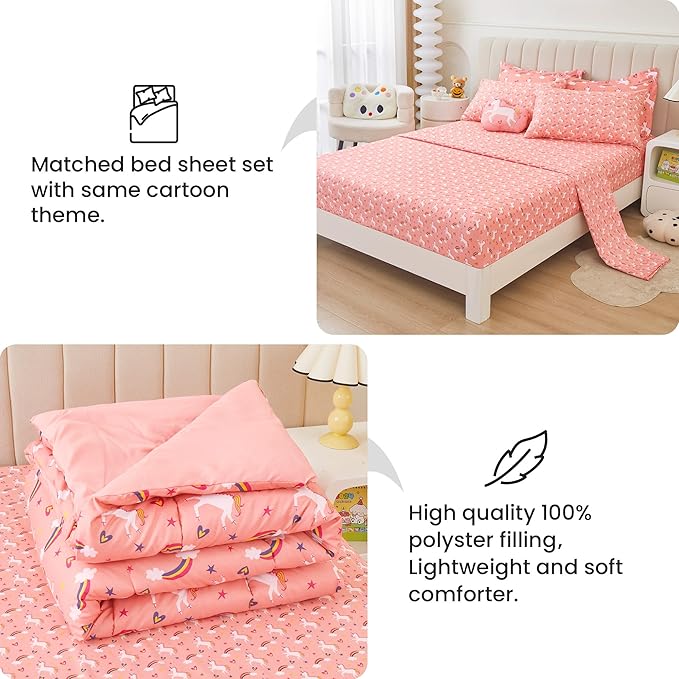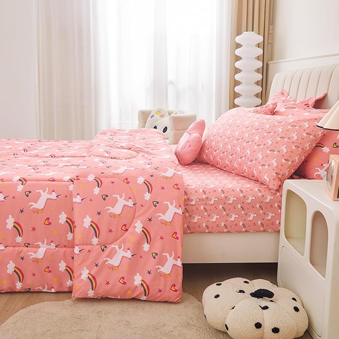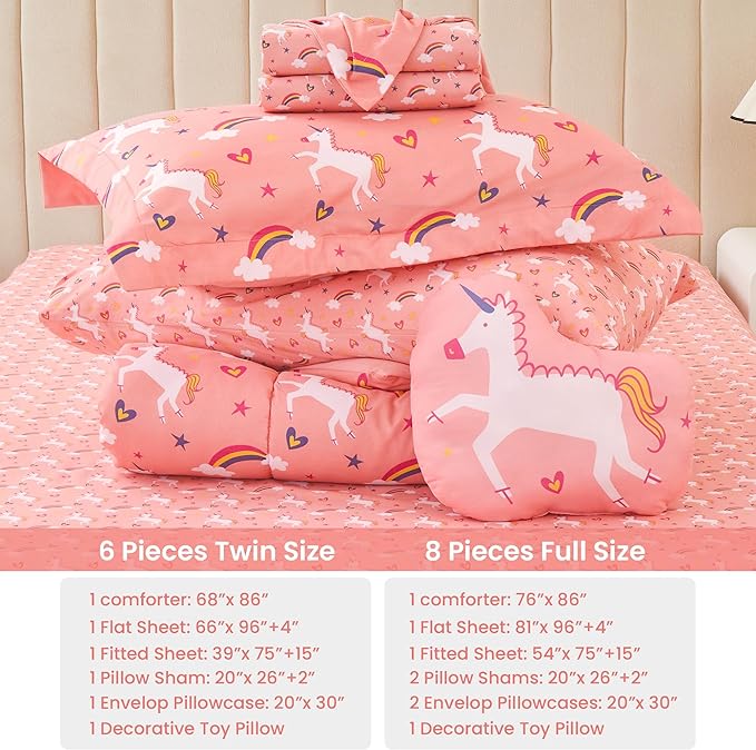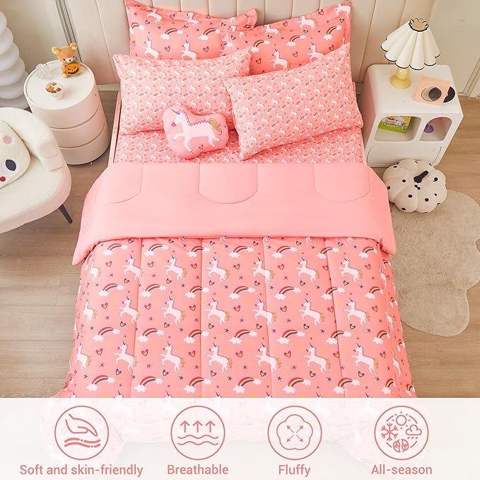 Mooreeke Twin Size Comforter Sets for Girls Kids, 6 Pieces Bed in a Bag Pink Unicorn Rainbow Bedding Comforter Sheet Set with Shams and Decorative Toy Pillow, Ultral Soft Microfiber Kids Bed Set