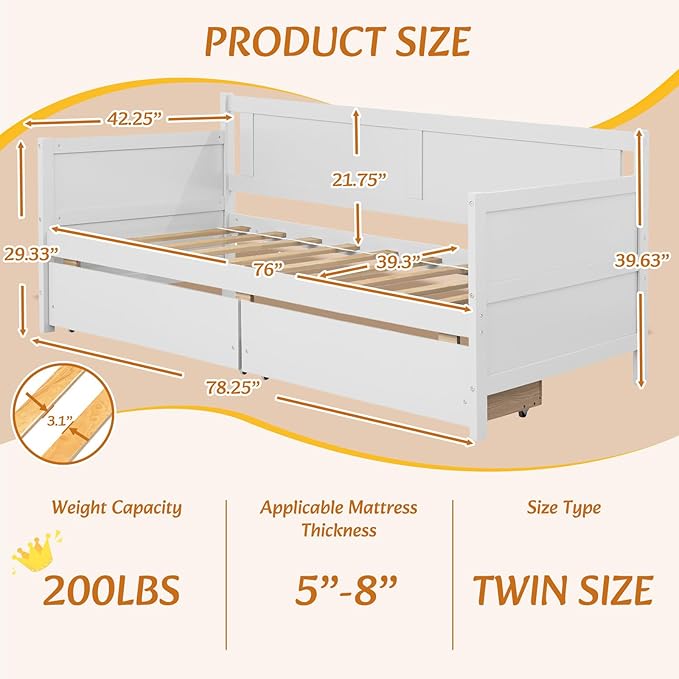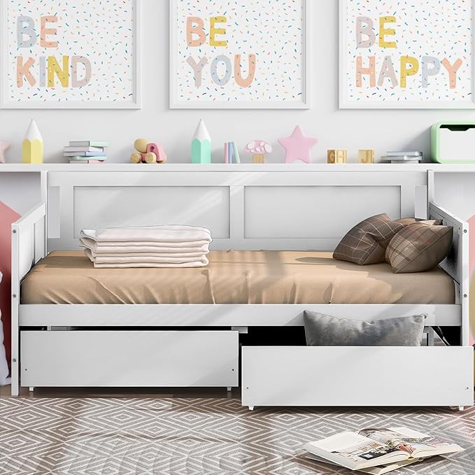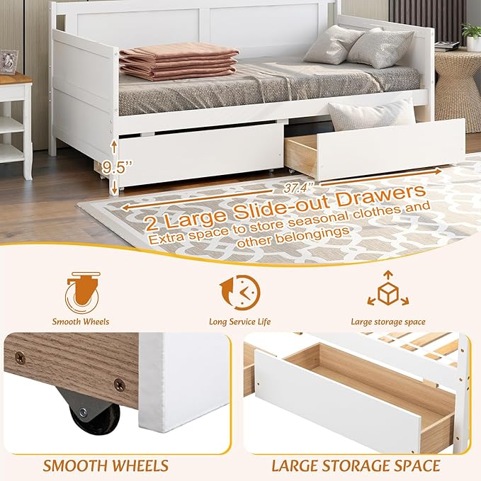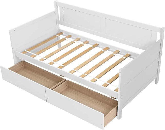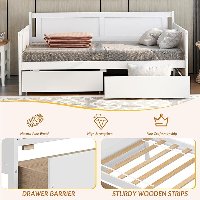 Twin Daybed with 2 Storage Drawers,Pinewood Twin Size Daybed Frame with Solid Guardrail,Dual-Use Sofa Daybed for Boys/Girls/Teens Bedroom, Easy to Assemble, No Box Spring Needed,White