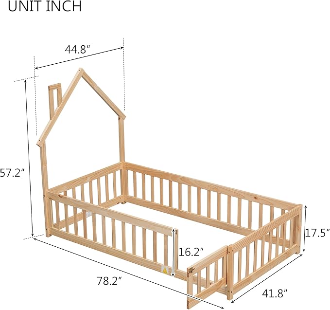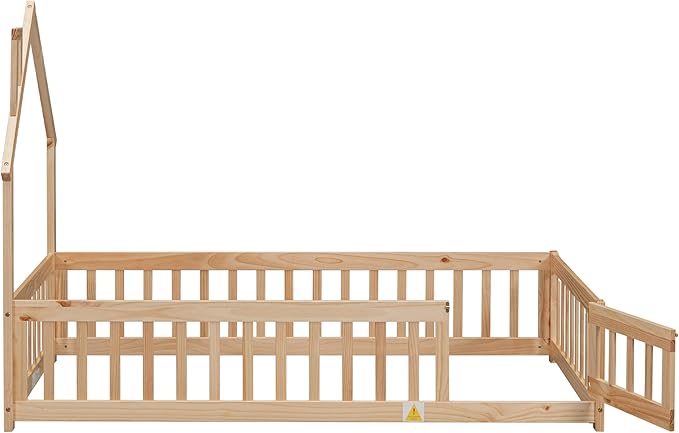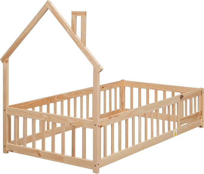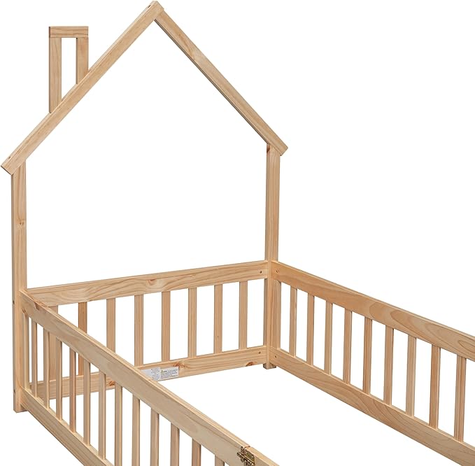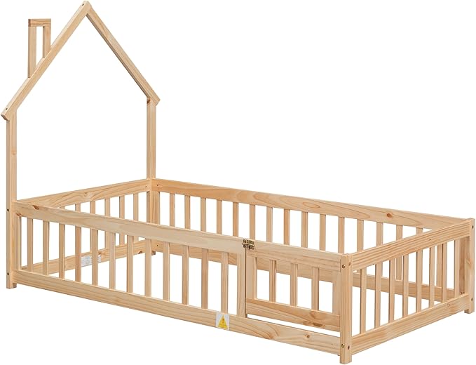 Twin Size Kids Montessori Floor Bed,House-Shaped Headboard Floor Bed for Kids,Floor Bed with Fence and Door,House Bed Twin Frame for Girls,Boys(Twin,Natural)