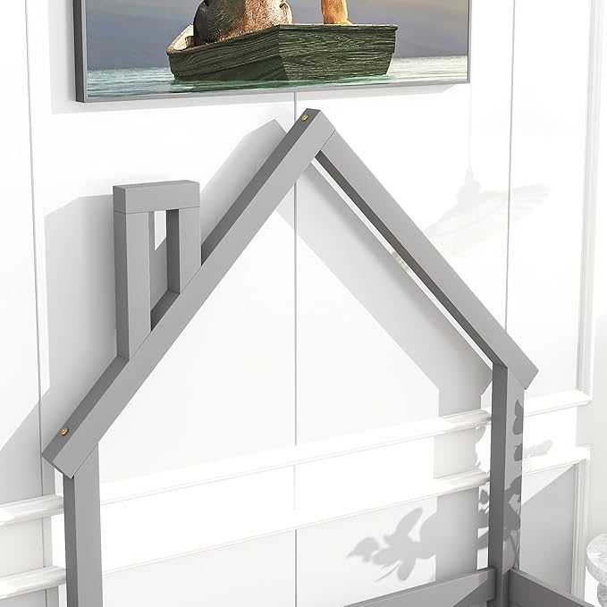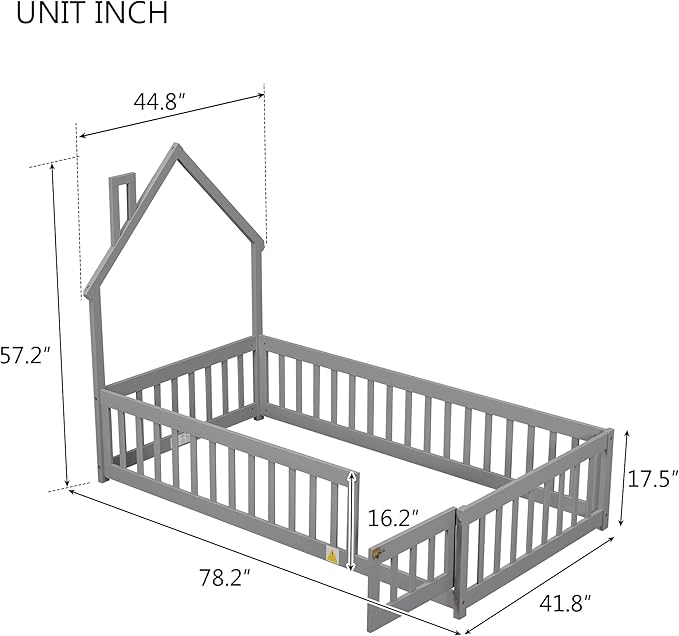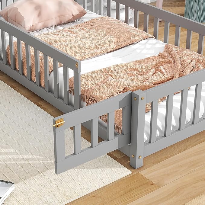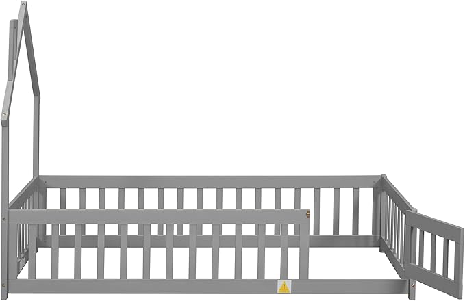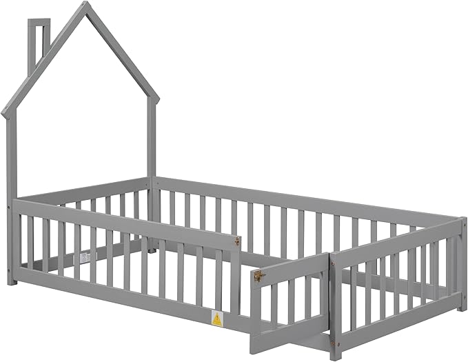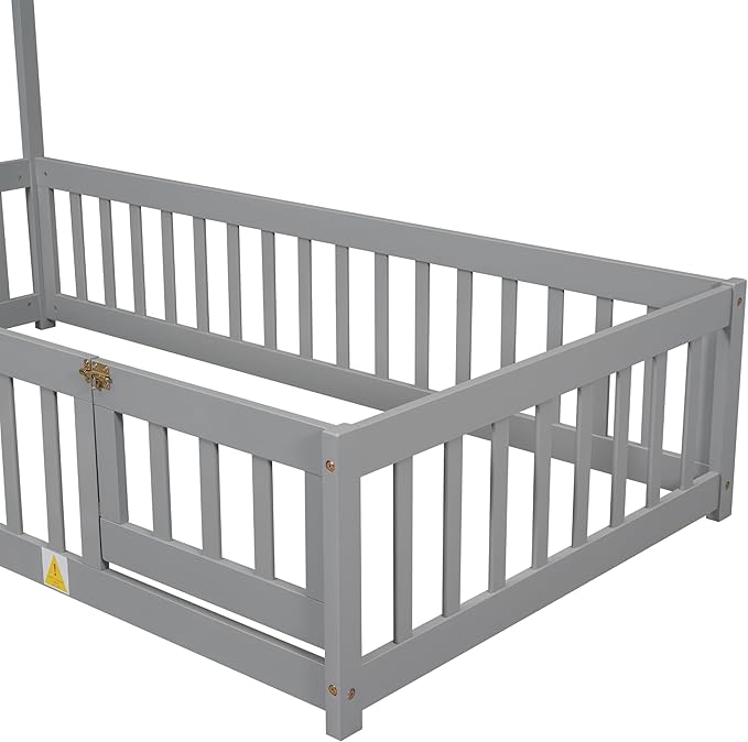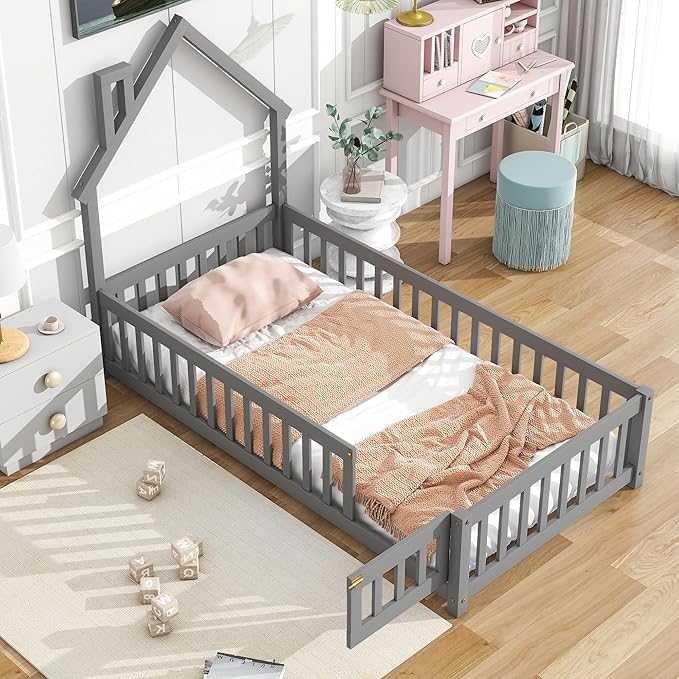 Twin Size Kids Montessori Floor Bed,House-Shaped Headboard Floor Bed for Kids,Floor Bed with Fence and Door,House Bed Twin Frame for Girls,Boys(Twin,Grey)