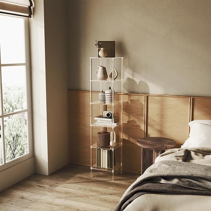 6 Tier Square Acrylic Bookshelf, Small Bookcase with Acrylic Fittings for Fixing to Wall, Corner Display Shelf for Living Room, Bedroom, Bathroom, Small Spaces, Clear, 11.6'' W x 53.9'' H