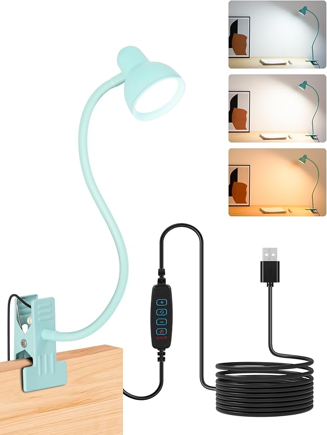 Clip on Reading Light for Bed 3 Color Modes, 10 Brightness Dimmable, Flexible Gooseneck Clip on Lamp, Eye Care Clip Light for Bed Headboard Desk Home Dorm, Teal